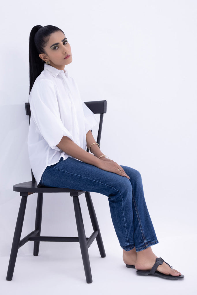 Loose Fit Button Down Top Loose-fit white button through shirt with collared neckline, short balloon sleeves and lac...