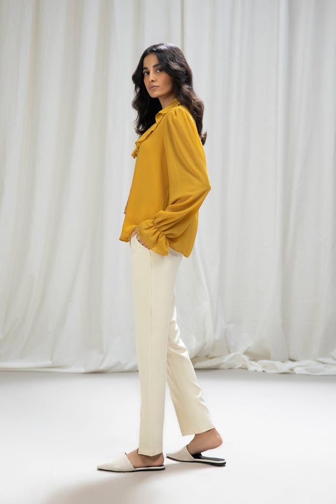 Ruffled Chiffon Blouse Chiffon blouse with collar, front ruffle and draw cord detail. Full sleeves with elasticated c...