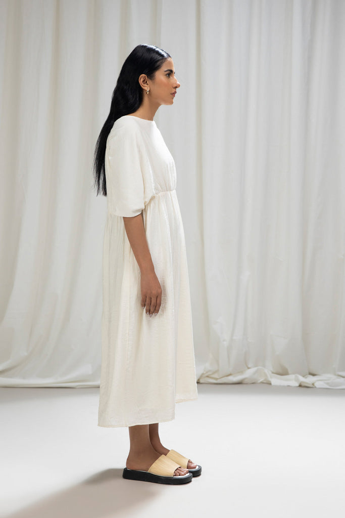 Kimono dress in textured fabric. Round neck. 3/4 sleeves. Cinched-in waist. Side seam pockets. Back gather detail on sleeves. Back zip closure. Lined.