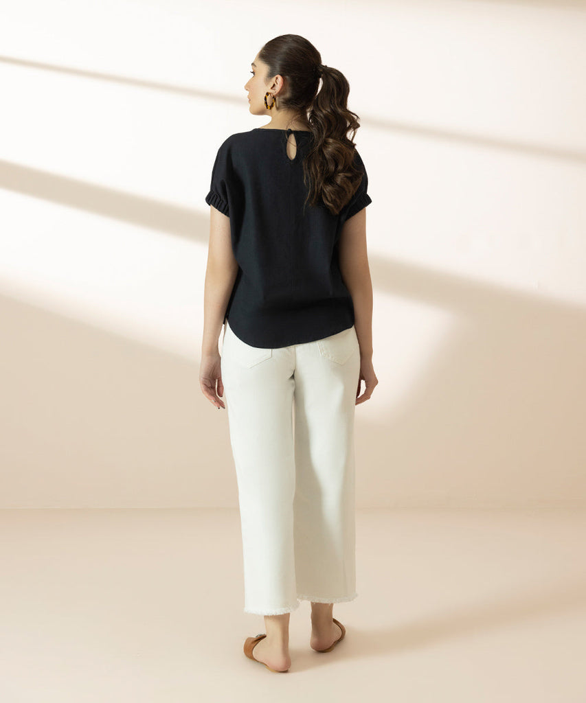 Linen blouse with kimono sleeve with elasticated cuff, round neck with a back button closure.Details: Colour: BlackFa...