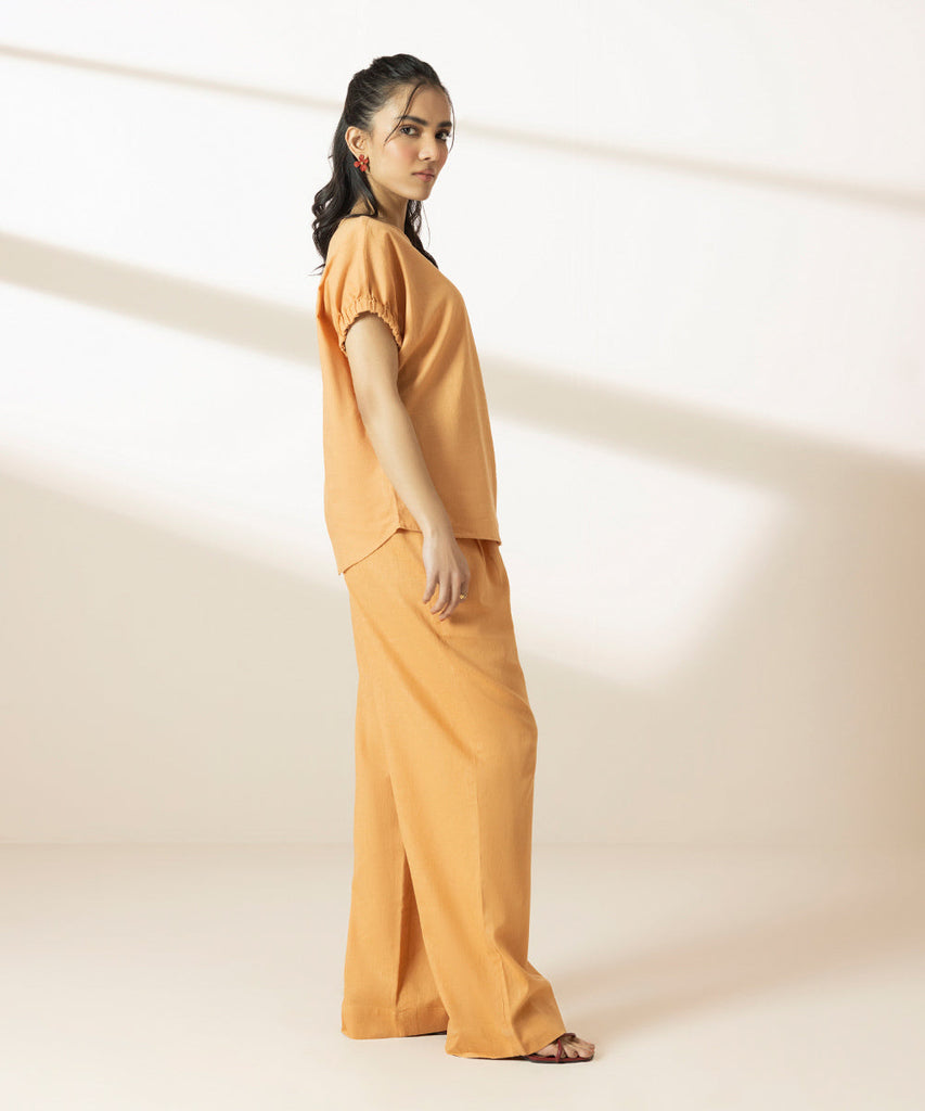 Linen blouse with kimono sleeve with elasticated cuff, round neck with a back button closure.Details: Colour: PeachFa...
