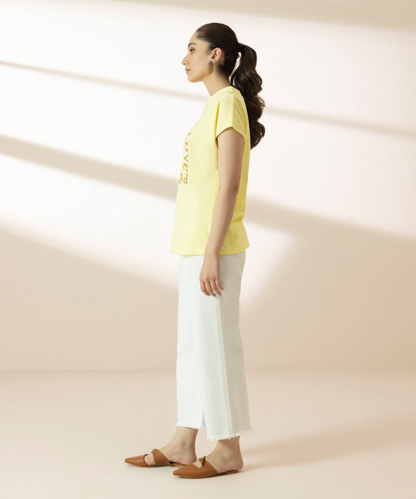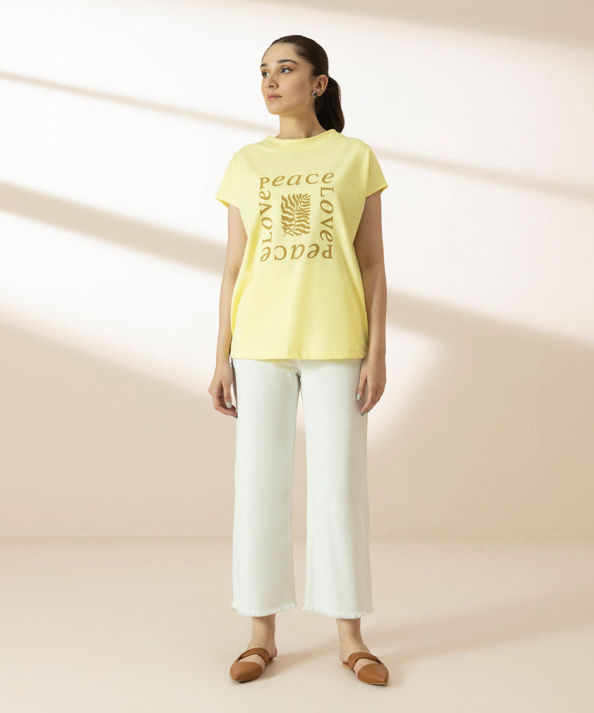 Extended shoulder T-shirt with back seam and round neck and graphic at front.Details: Colour: YellowFabric: 100% Cott...
