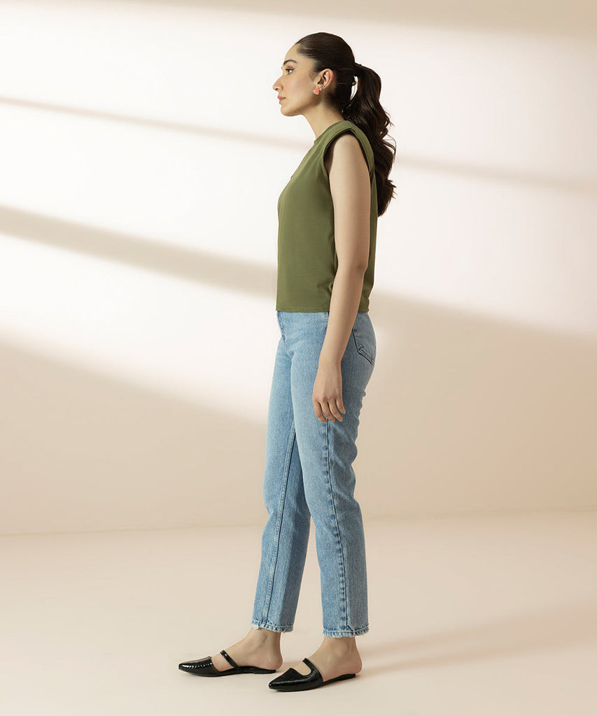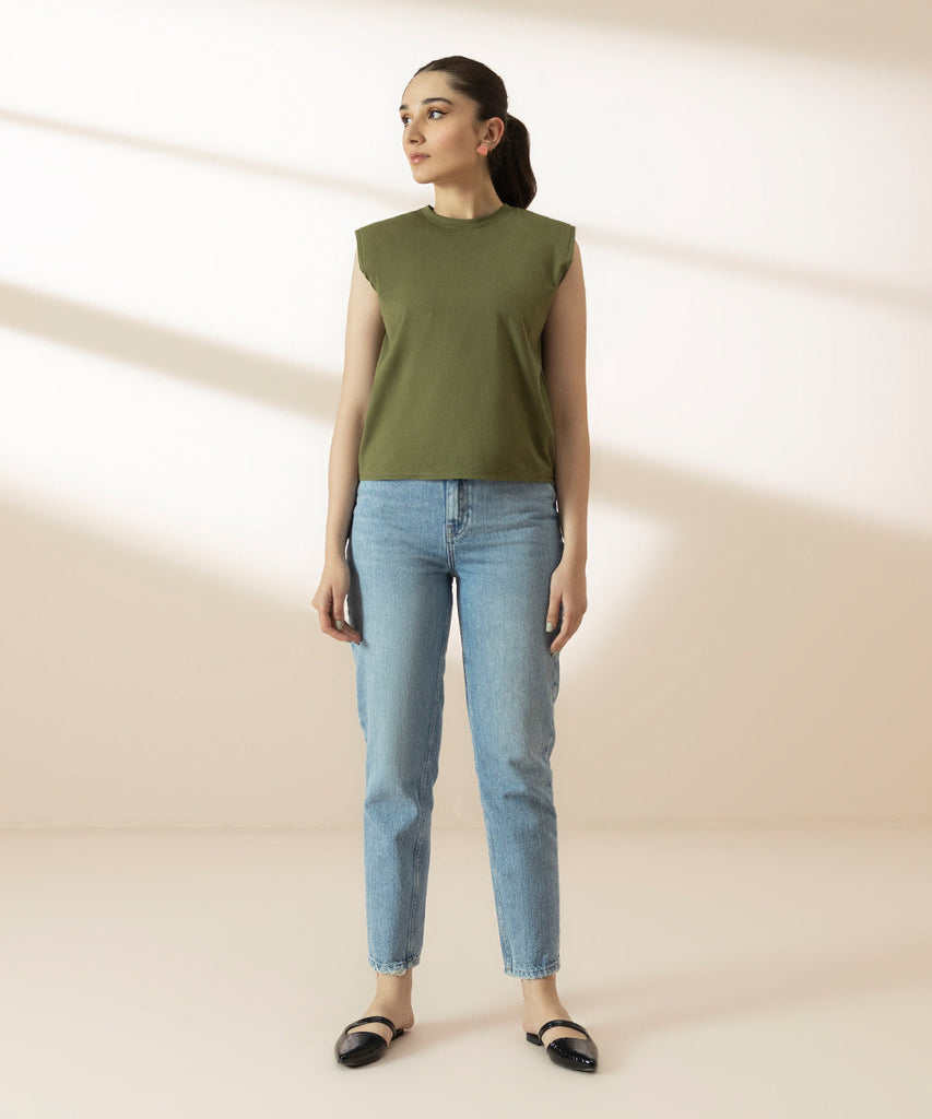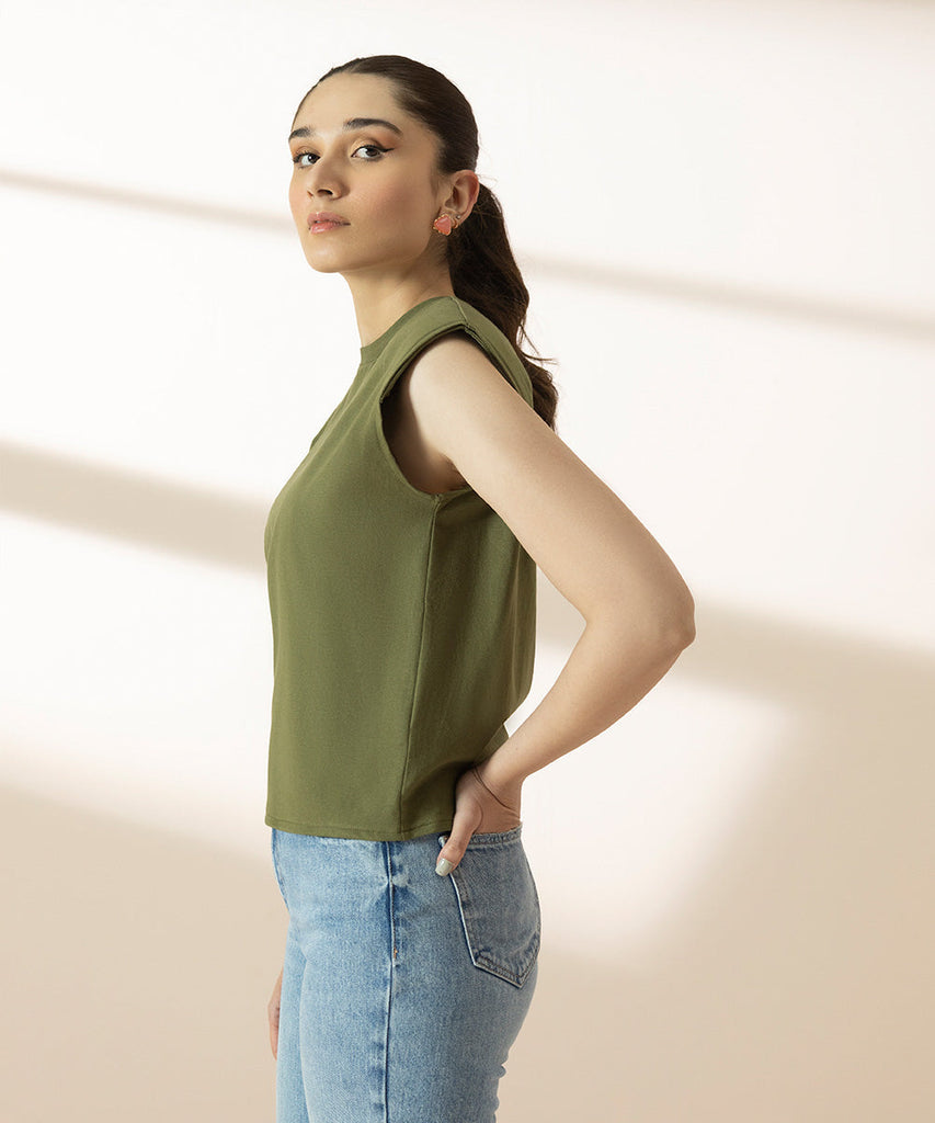 Shoulder padded sleeveless T-shirt with round neckline.Details: Colour: OliveFabric: 100% Cotton Size & FitModel ...