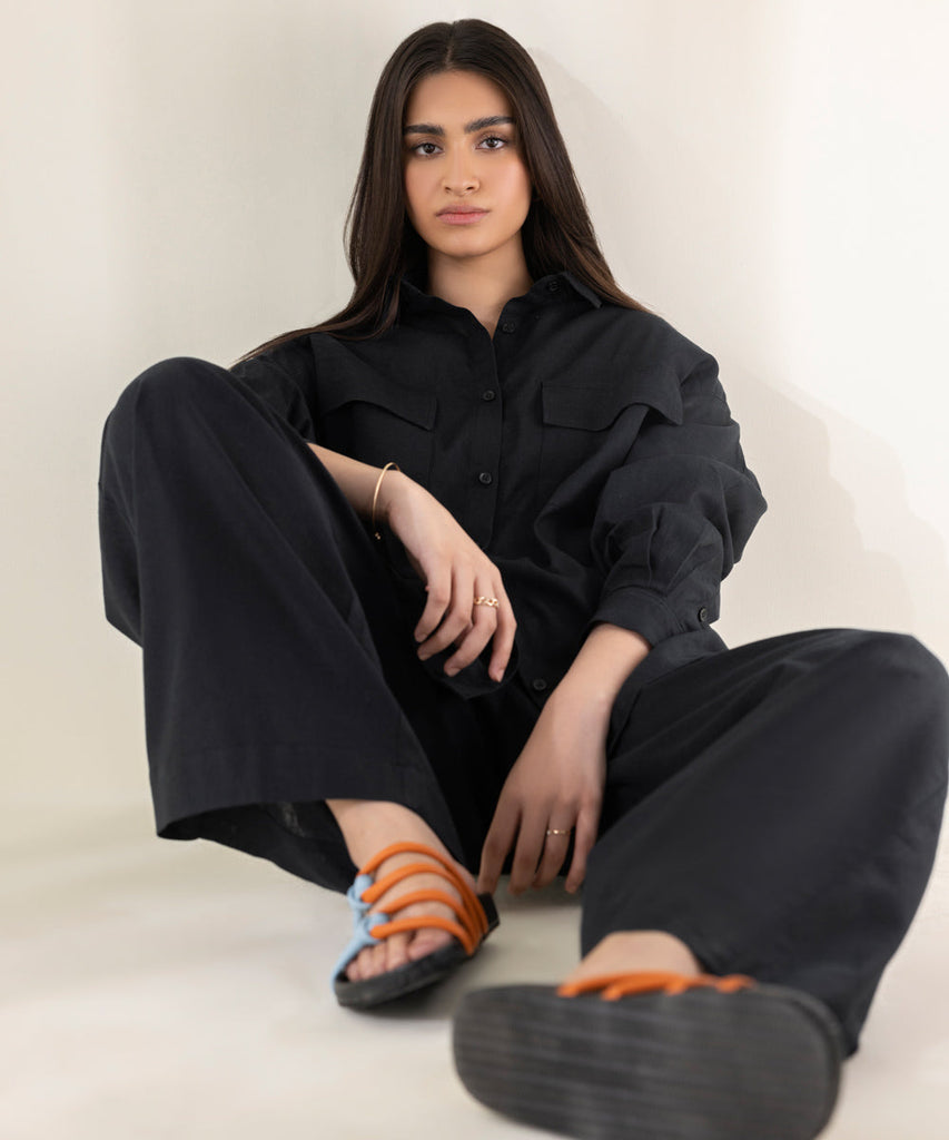 Button through linen shirt with collar. Full sleeves and patch pockets. Details: Colour: Black Fabric: Linen Size &a...