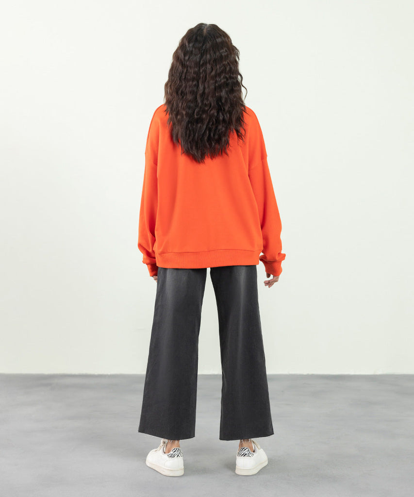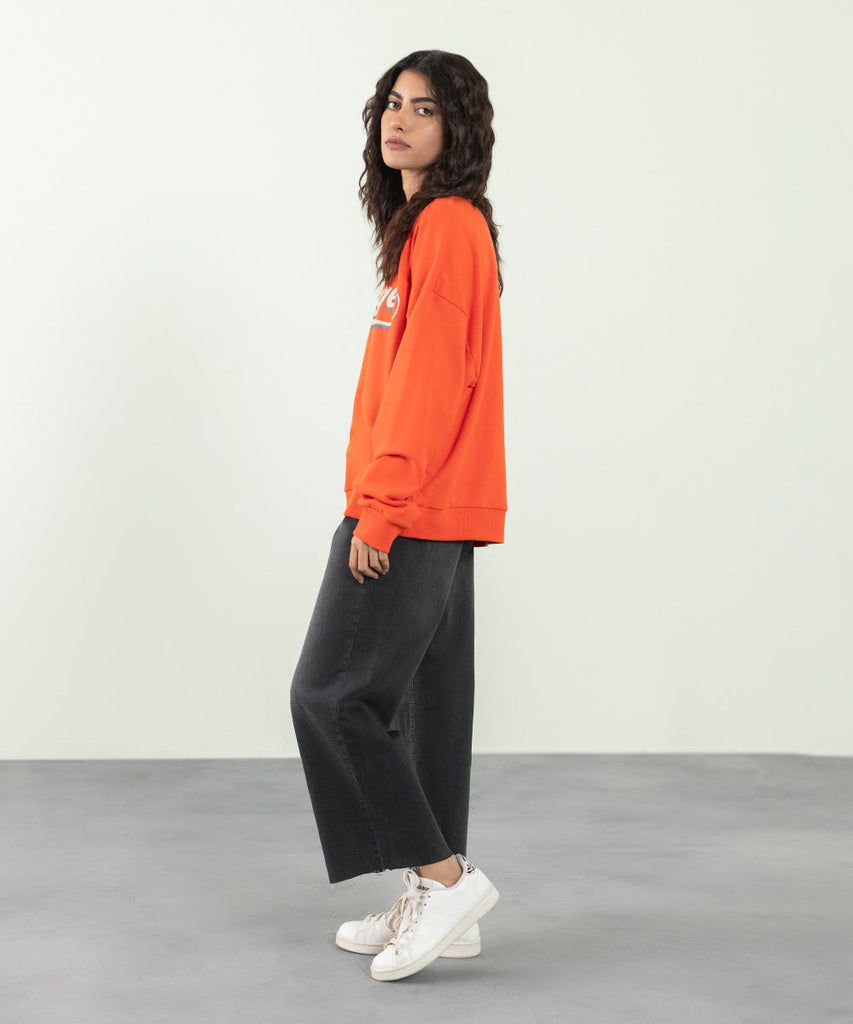 Oversized sweatshirt with graphic print. Round neck and full sleeves with rib trims. Details: Colour: Orange Fabric:...