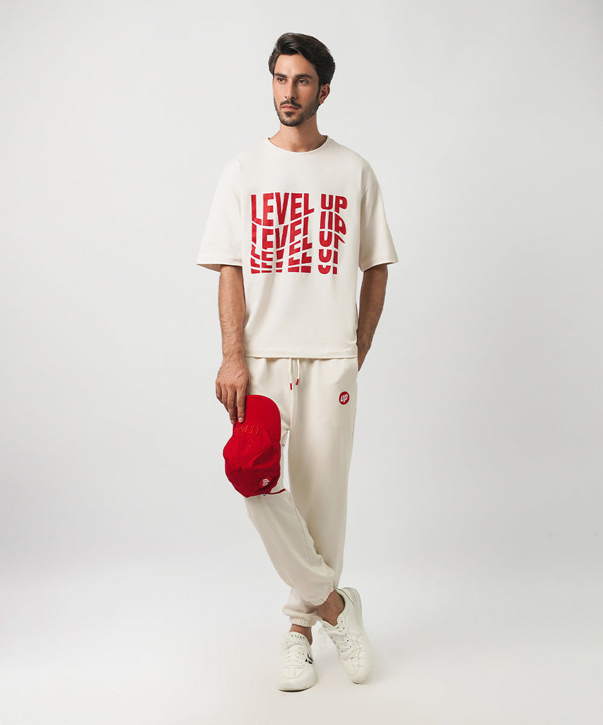 Oversized T-shirt with round neck and short sleeves. "LEVEL UP” graphic print on front contrasting back neck tape.