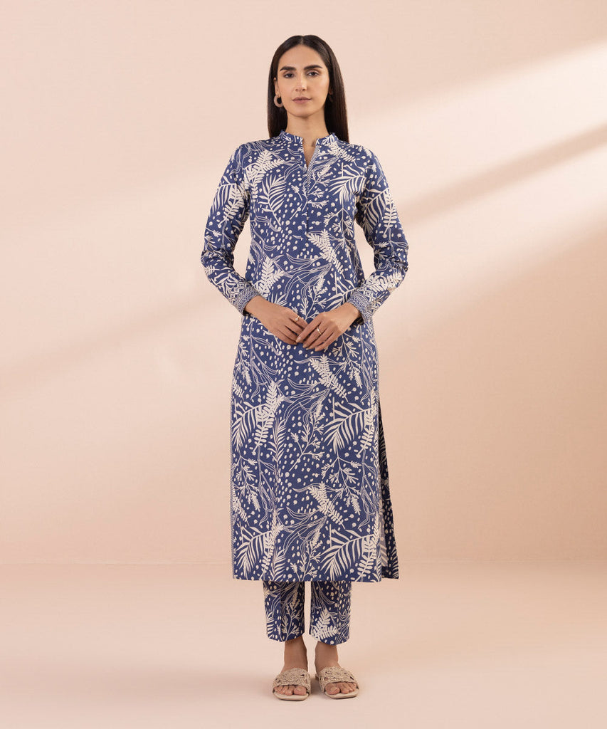 Experience summer florals with our blue and white, printed two-piece featuring a lawn shirt and cambric trouser.Unsti...