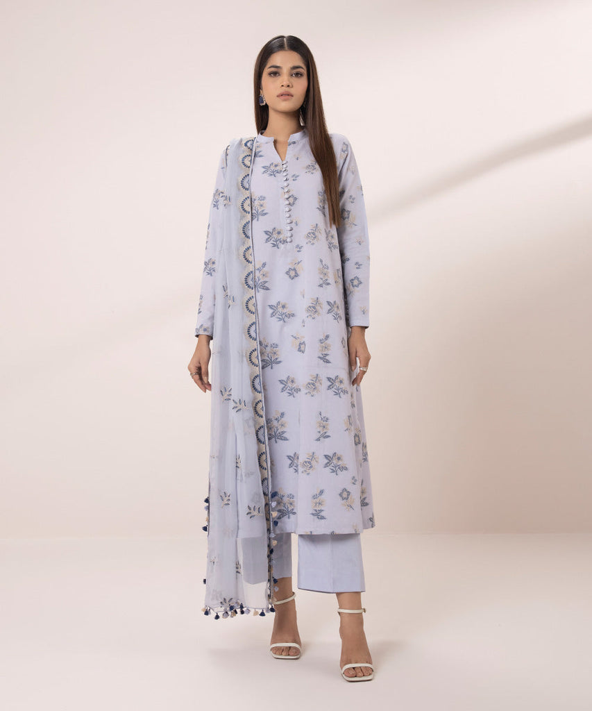 Immerse yourself in the vibrancy of tradition, with our lilac three-piece embroidered suit featuring a jacquard shirt, crinkle chiffon dupatta and cambric trousers.