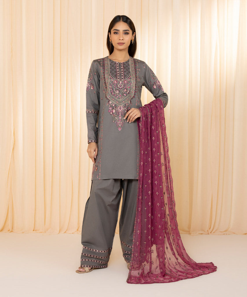Enveloped in embellishments and intricate patterns our grey cotton satin three-piece exudes regal indulgence and timeless allure.