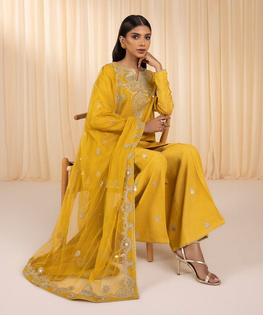 Radiate at dholki or mehndi night in our yellow three-piece featuring intricate pattens.