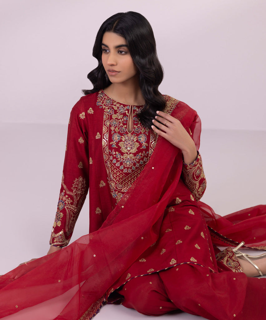 Experience the timeless charm of traditional style with our vibrant red three-piece embroidered suit featuring a raw silk shirt, organza dupatta, and viscose raw silk trousers.