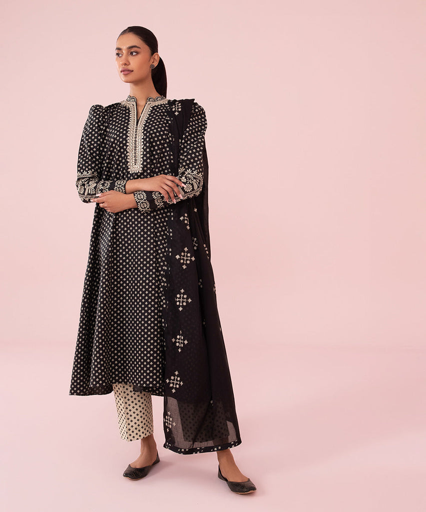 Exude timeless grace with our black three-piece featuring a voile dupatta.
