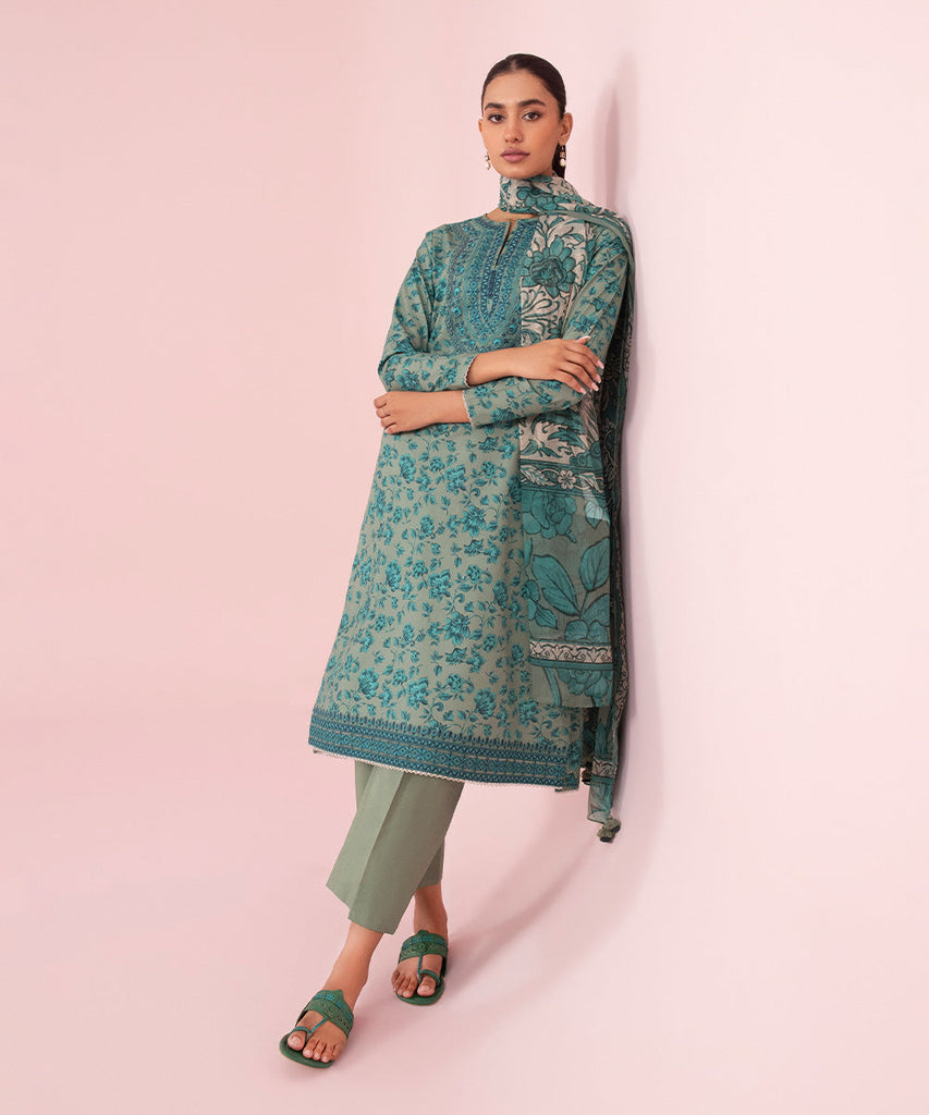 Exude timeless grace with our teal grey three-piece featuring a chiffon dupatta.Unstitched 3-Piece Shirt: Printed Cam...