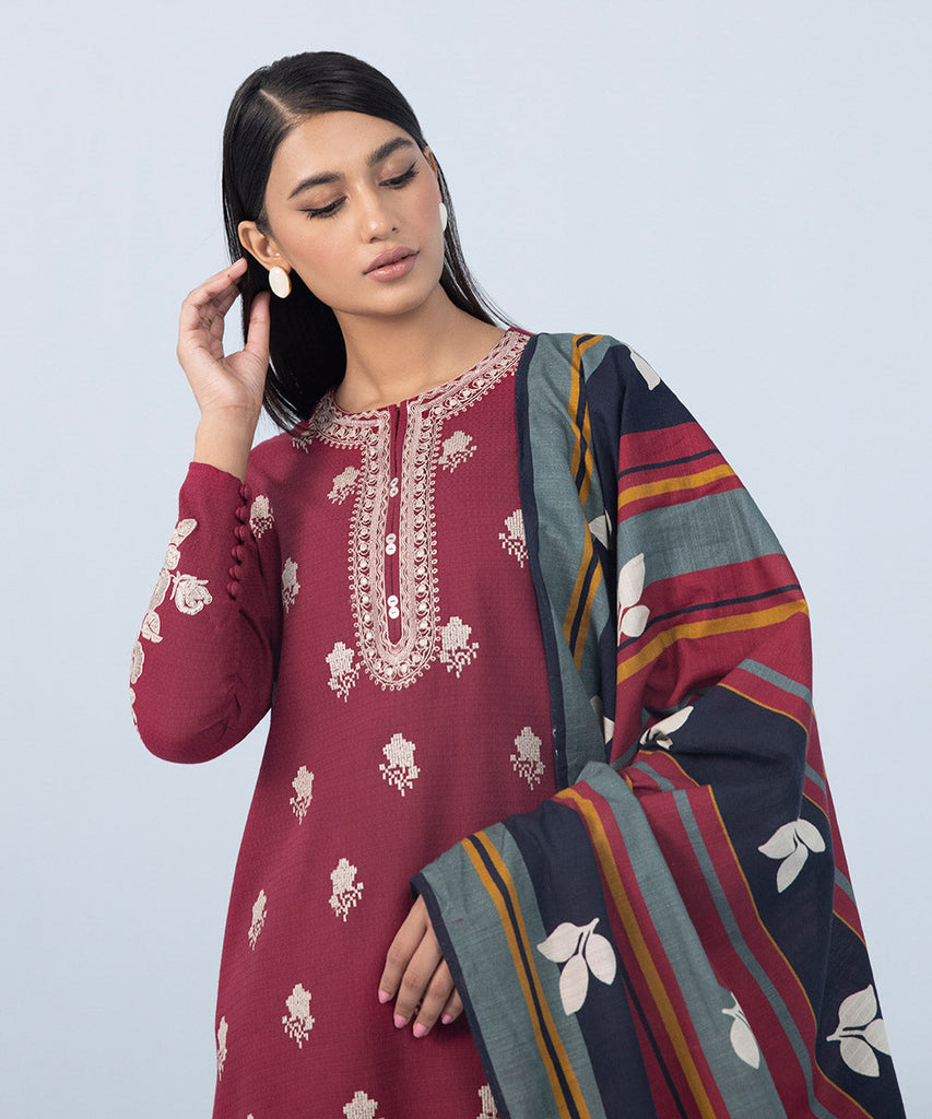 Mesmerize in our maroon dobby three-piece featuring intricate neckline and patterns paired with a blended shawl.