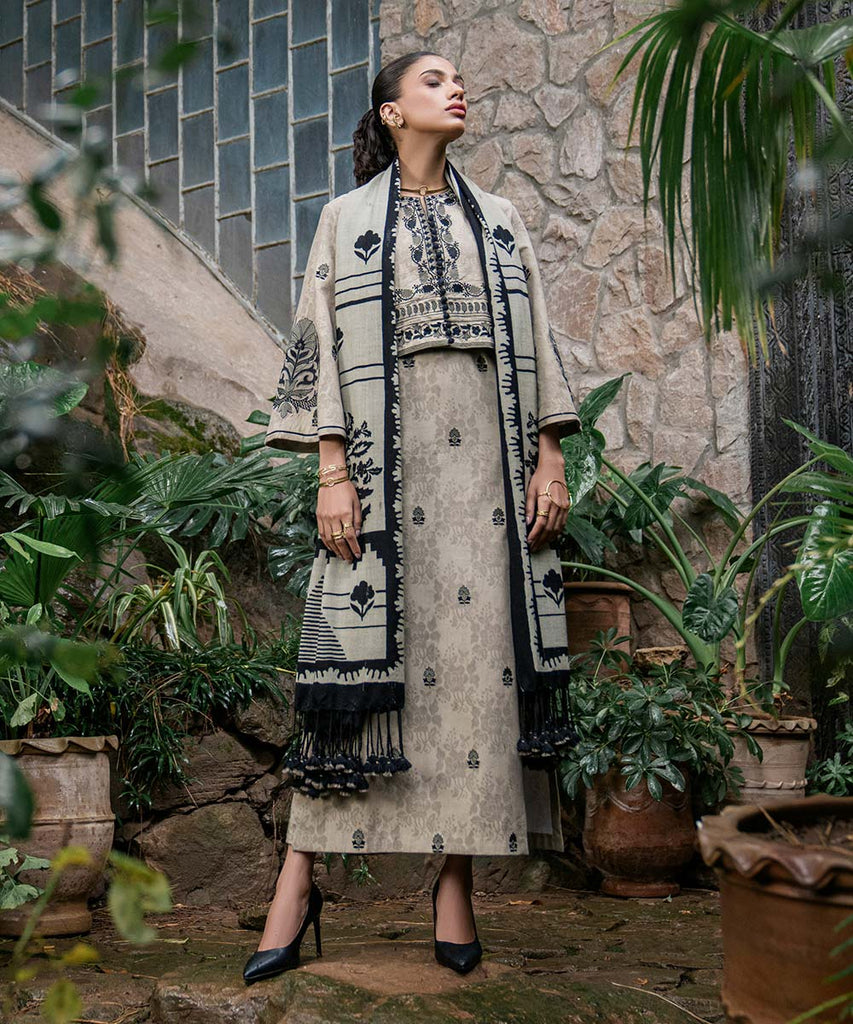 Embrace the winter season in style with our khaki jacquard three-piece paired with a woolen shawl.
