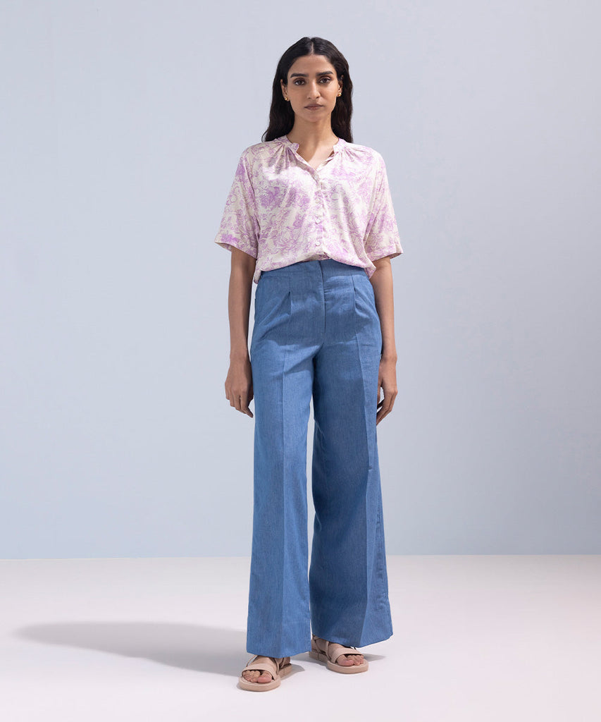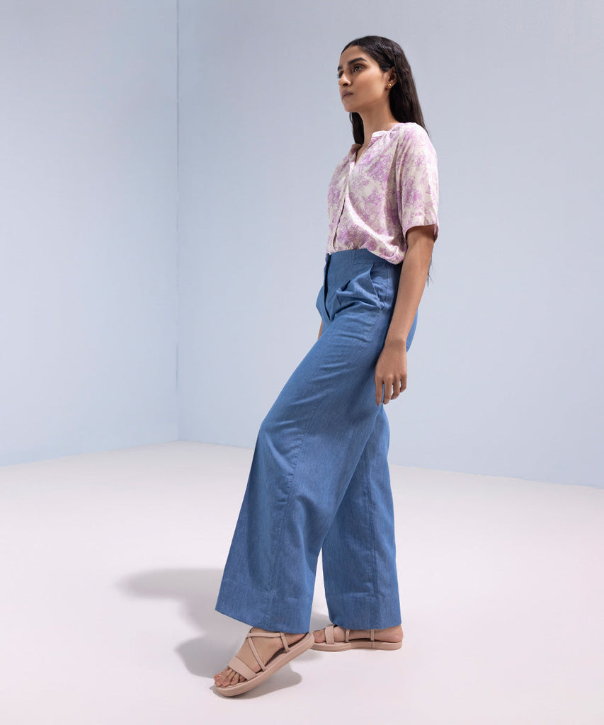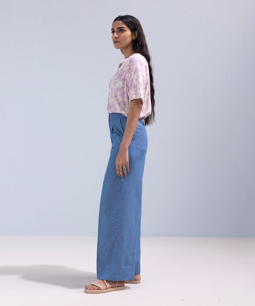 Wide leg trousers in light weight denim fabric. Front zip closure. Elasticated back. Side pockets. Wide hem depth. Back faux pocket detail.