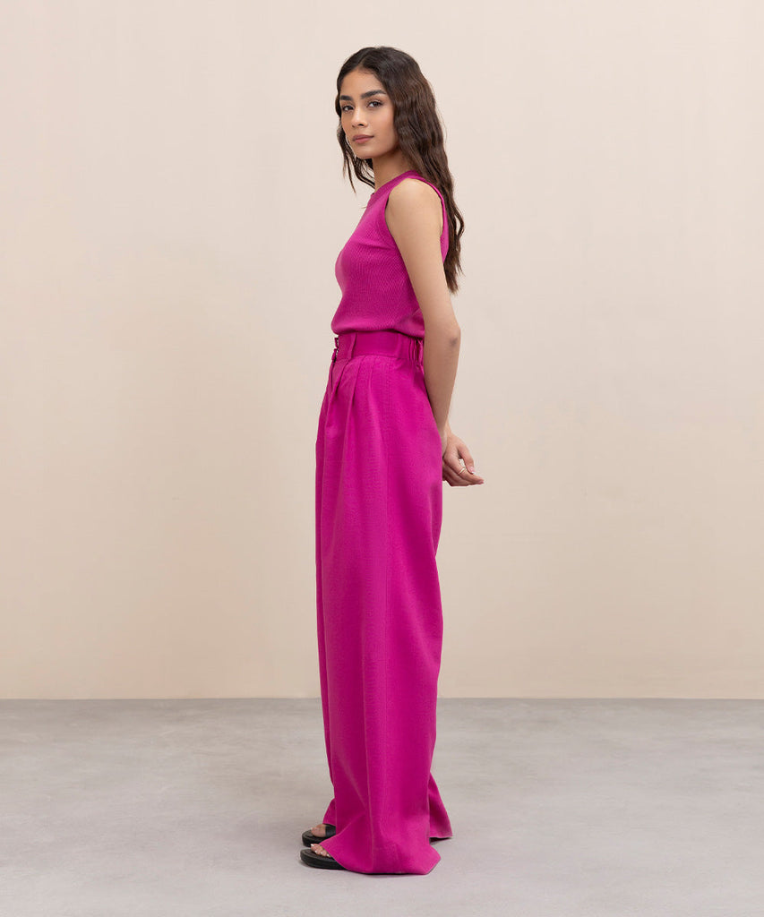 Wide leg trousers in blended linen fabric. Front zip closure. Elasticated back. Pleat detail on front. Side front poc...