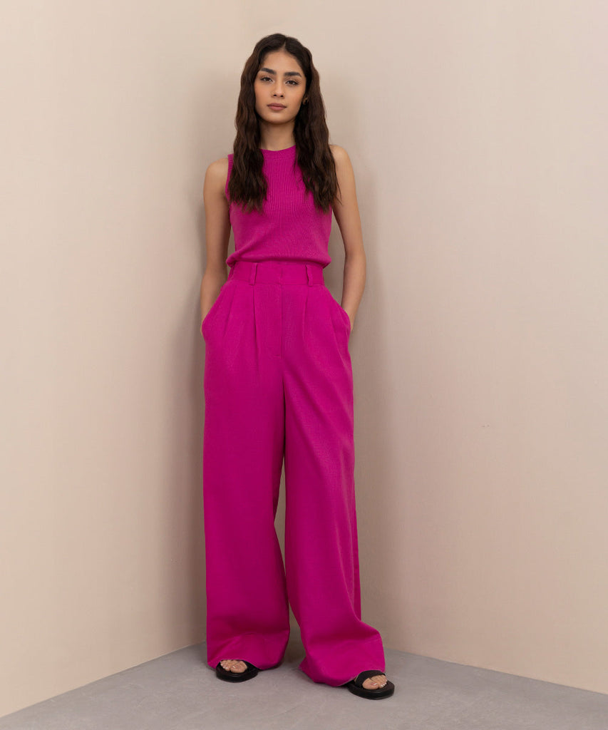 Wide leg trousers in blended linen fabric. Front zip closure. Elasticated back. Pleat detail on front. Side front pockets and back faux pockets.