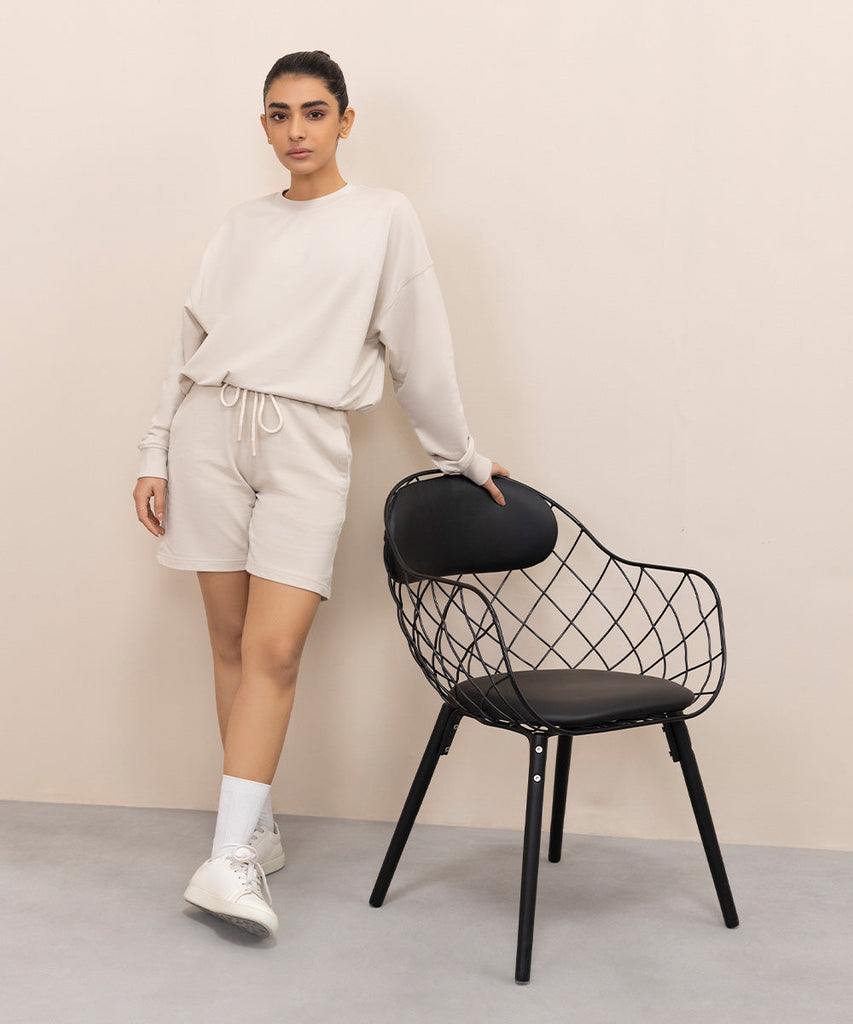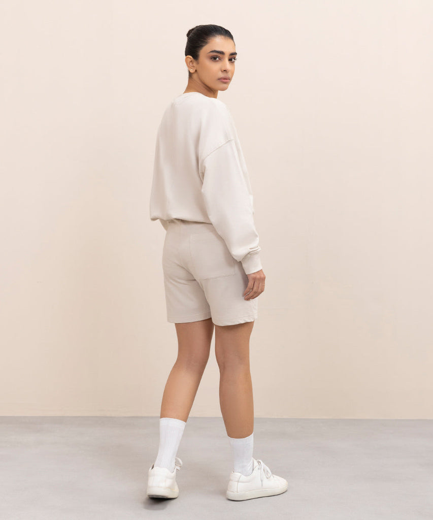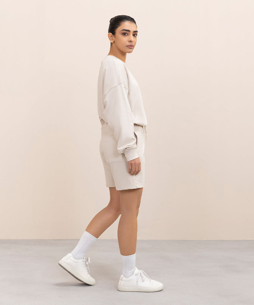 Shorts made in light-weight summer terry fabric. Elasticated waistband and drawcord. Side pockets.