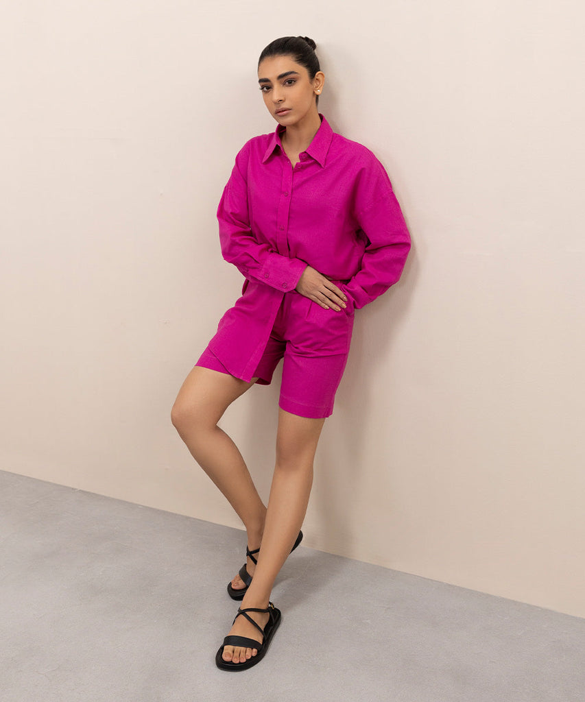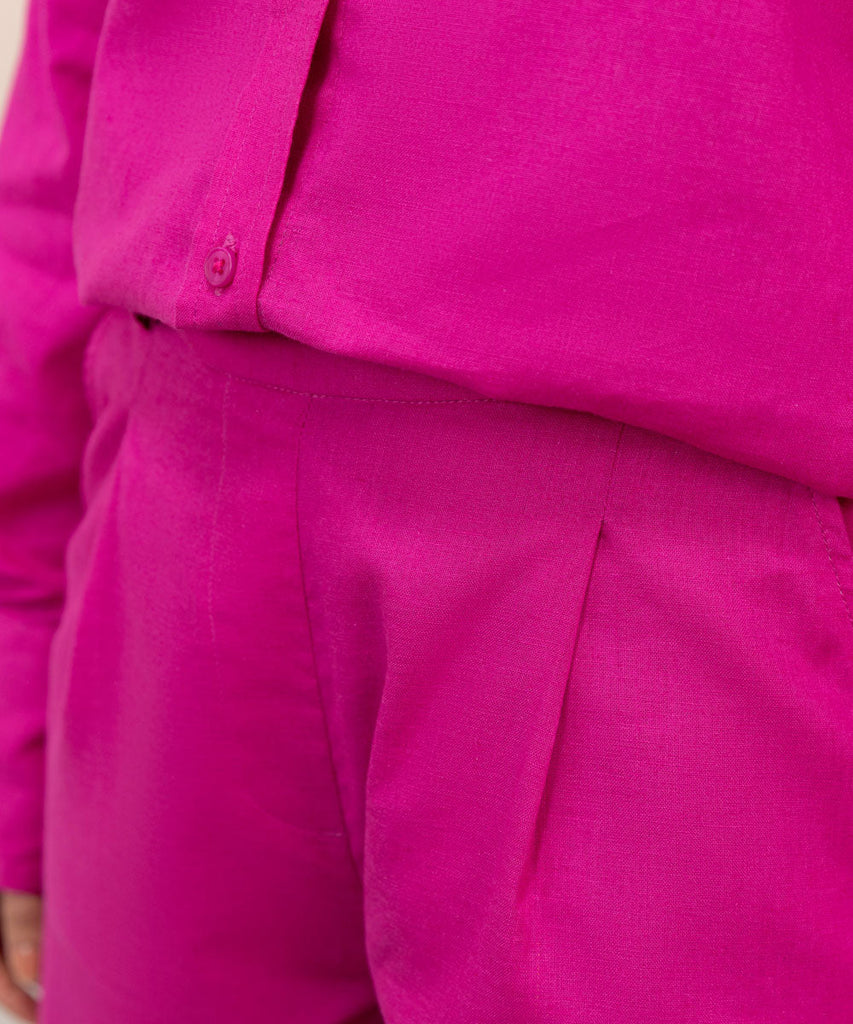 Shorts in linen blended fabric. Front zip closure. Elasticated back. Side pockets.