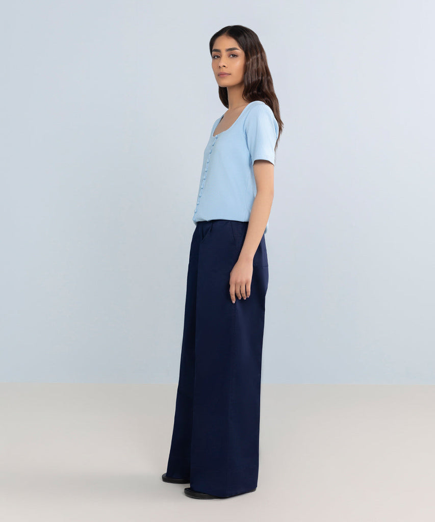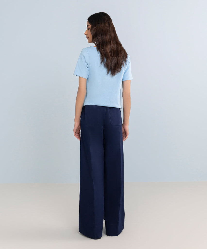 Wide leg trousers in stretched cotton fabric. Front hook and zip closure. Pleats at front. Side pockets. Elasticated waistband. Back patch pockets.