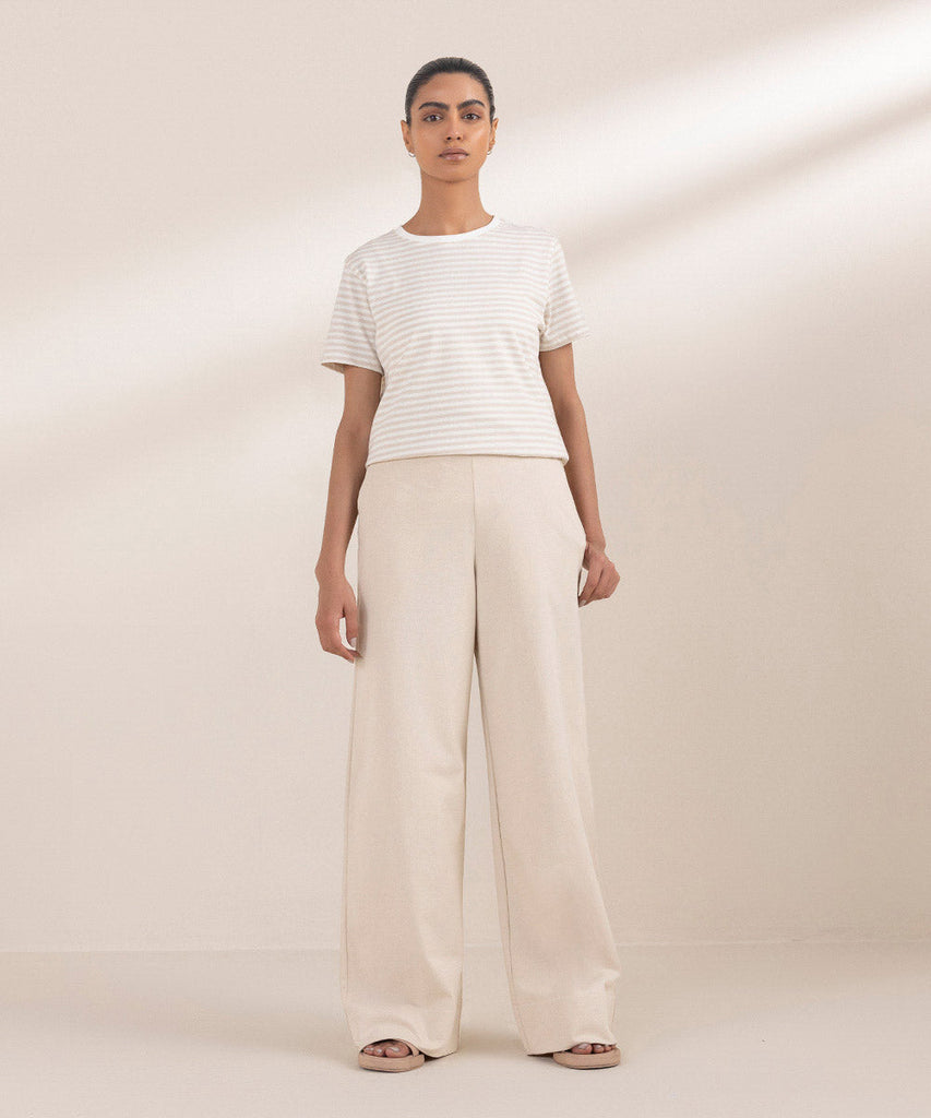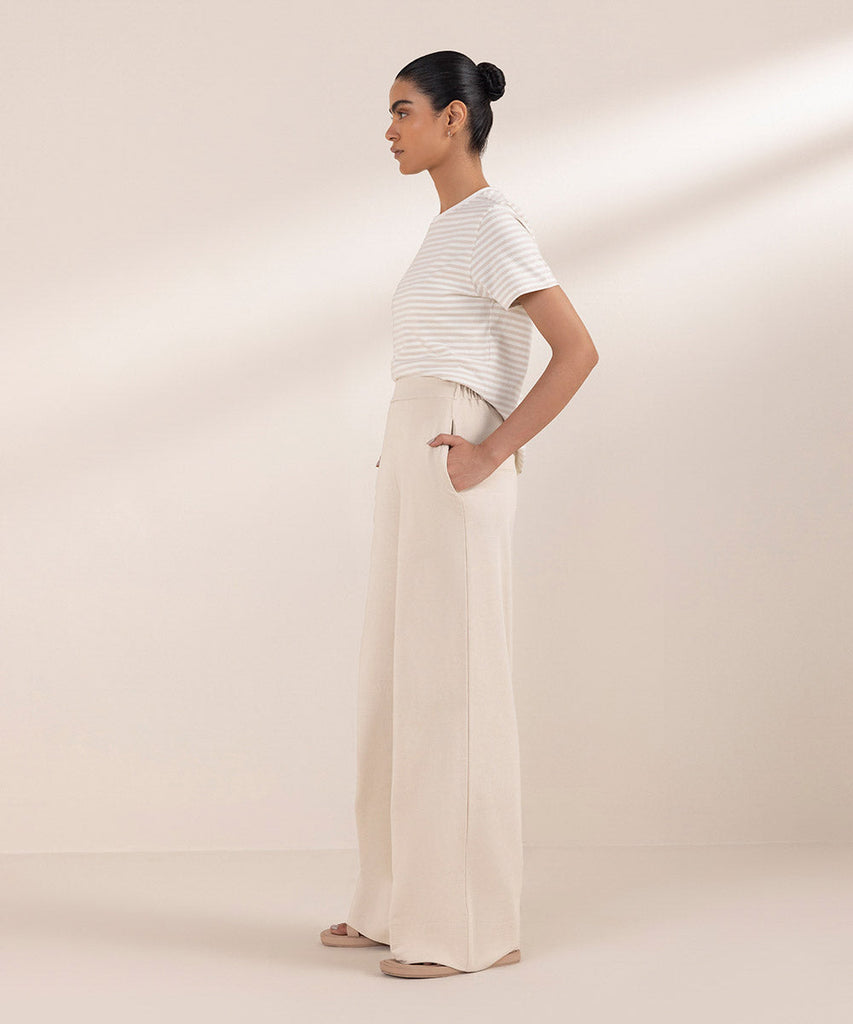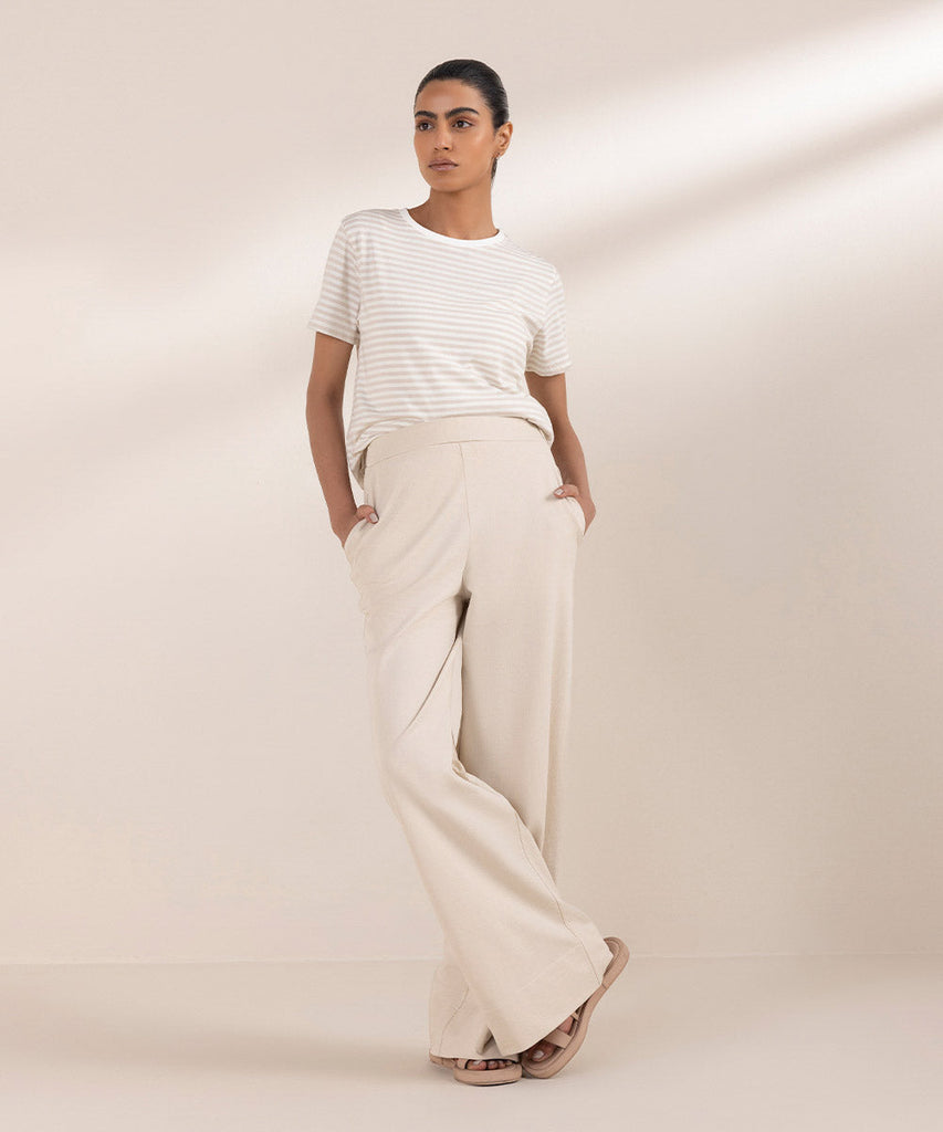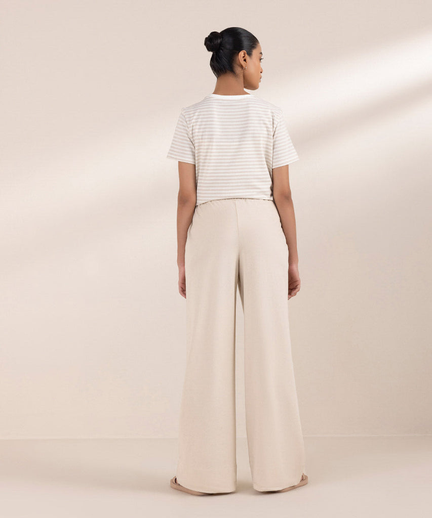 Wide leg trousers in summer terry fabric. Elasticated waist and side pockets.