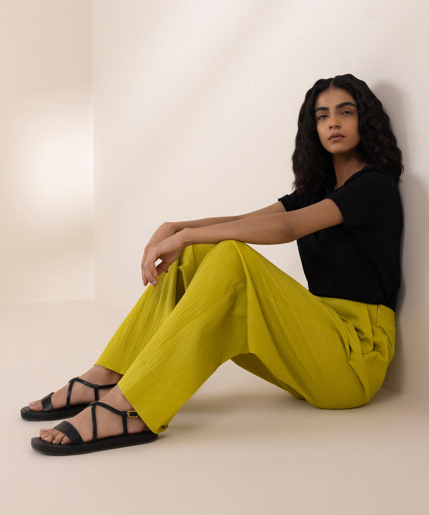Wide leg trousers in seersucker fabric. Fixed belt. Side zip closure. Side pockets. Details: Colour: YellowFabric: 98...