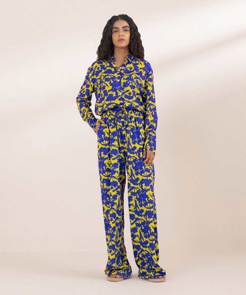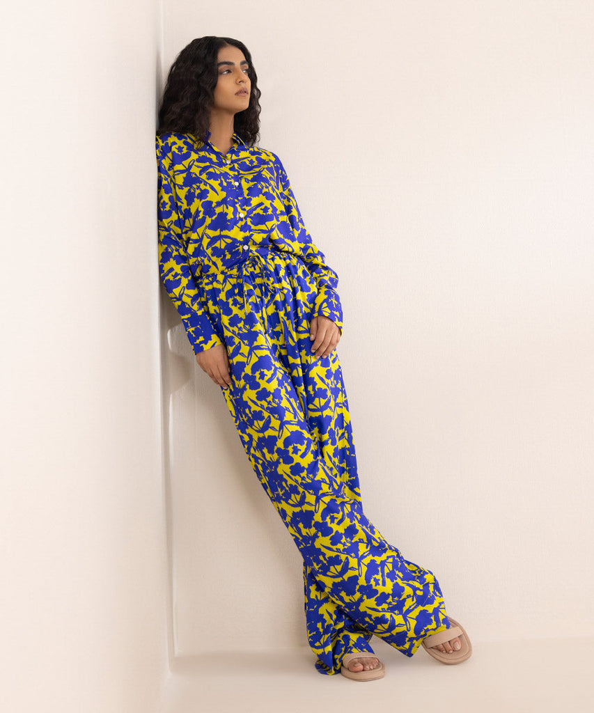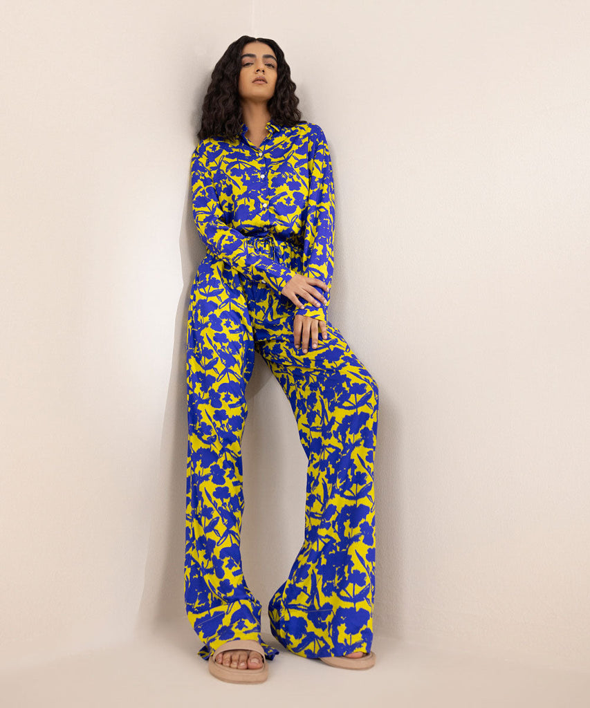 Wide leg trousers in flowy fabric. Adjustable waist with drawcords. Side pockets. Details: Colour: Blue & YellowF...