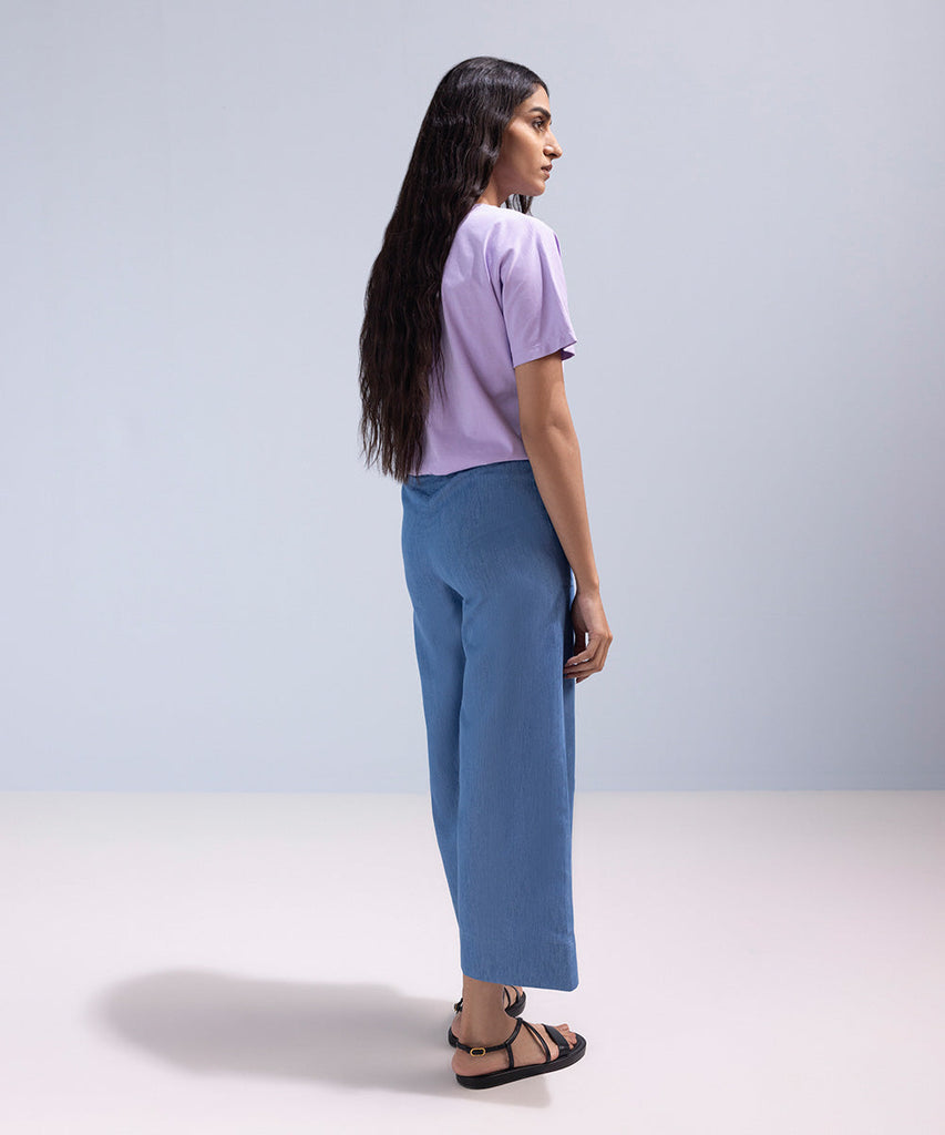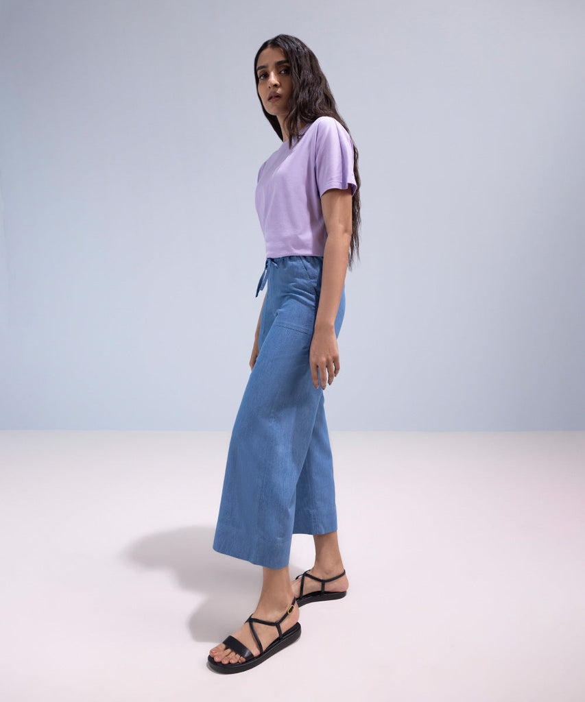 Culottes made in light-weight denim fabric. Elasticated waist with drawcord. Side patch pockets.