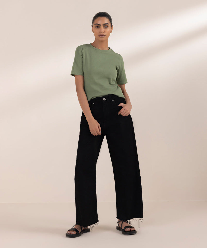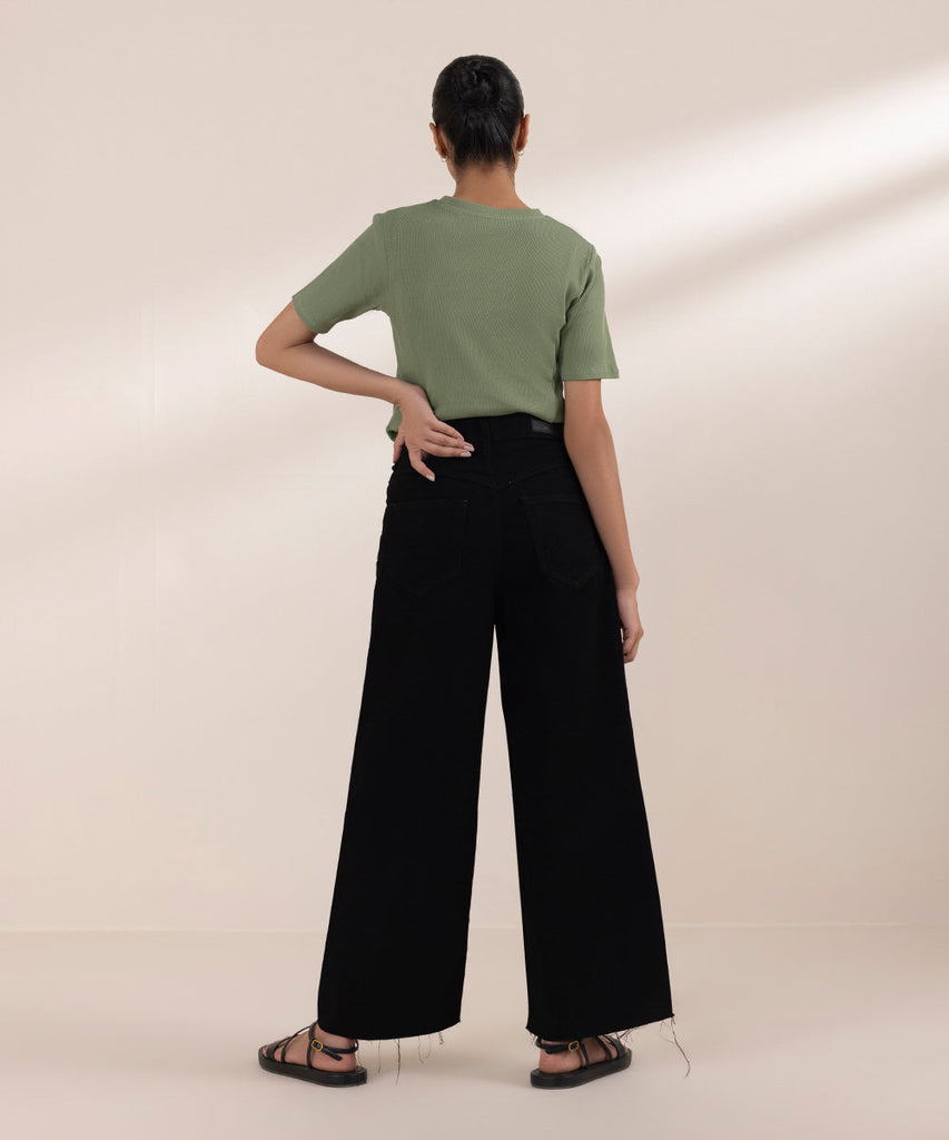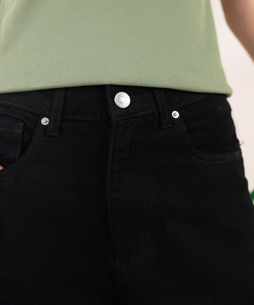 Basic five pocket high rise jeans with raw cut hem in rigid fabric. Details: Colour: Black Fabric: 100% Cotton Size ...