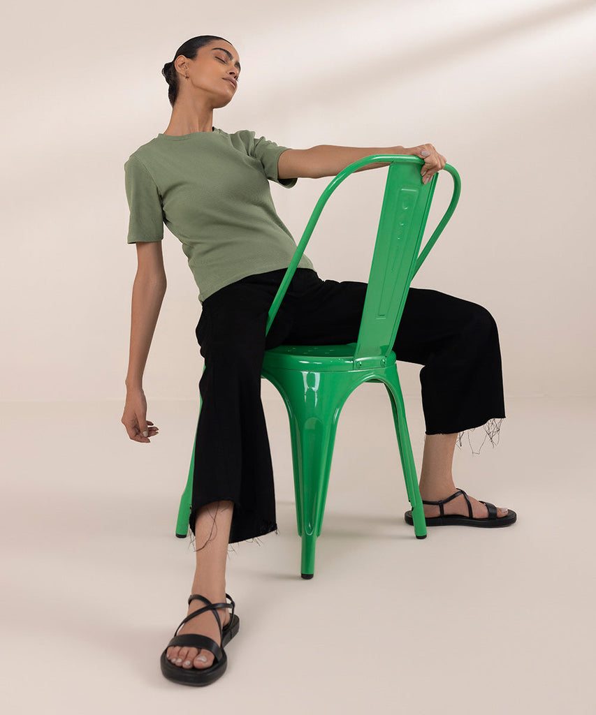 Basic five pocket high rise jeans with raw cut hem in rigid fabric.
