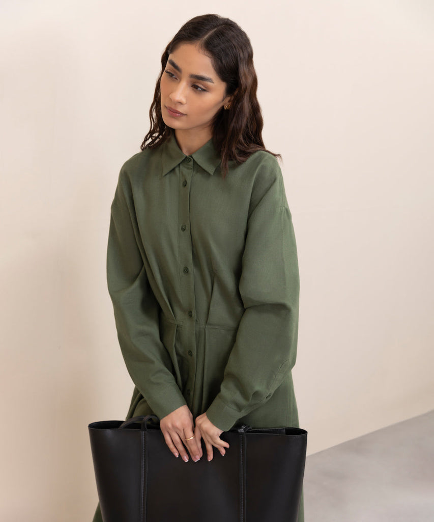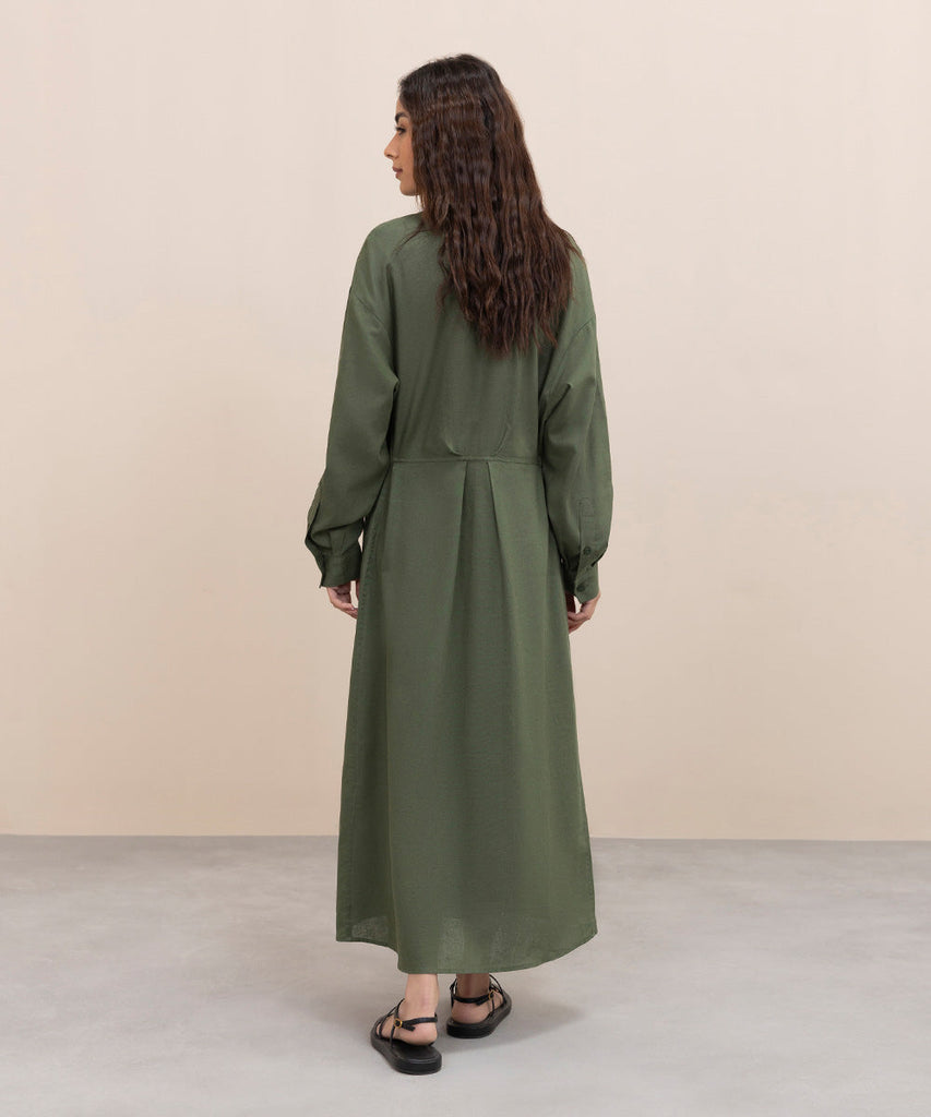 Button through dress in blended linen fabric. Long sleeves with cuffs. Pleat detail on front and back.