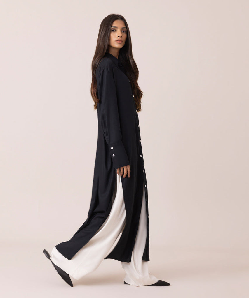 Button through long shirt with collar. Full sleeves and long side slits. Details: Colour: Black Fabric: 100% Viscose...