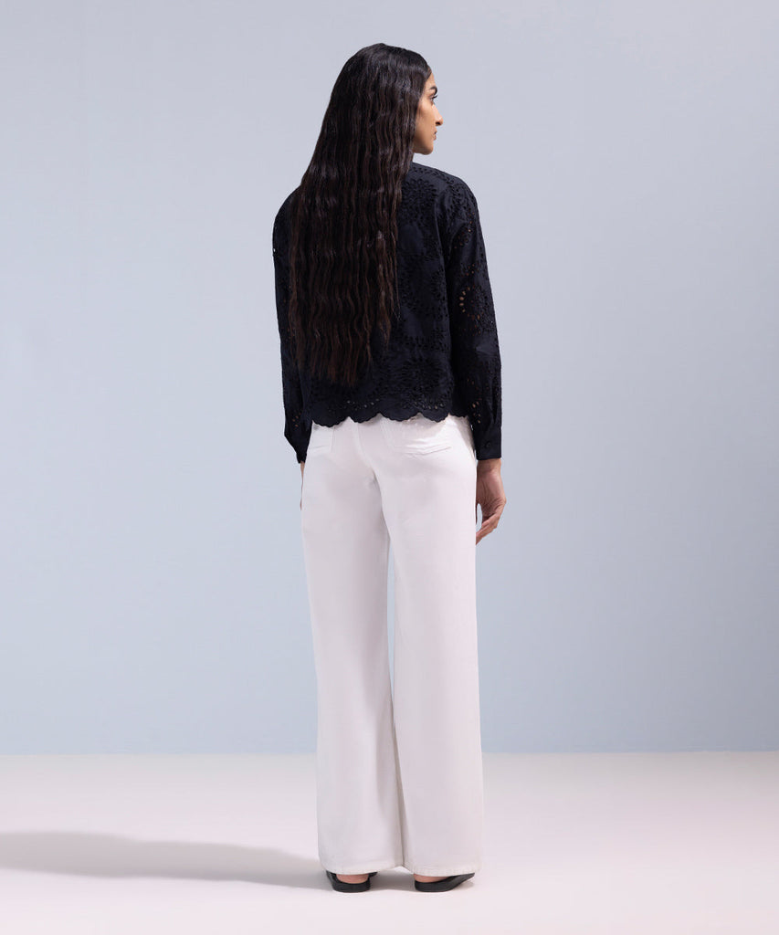 Shirt with overall embroidery. Collar with button through opening. Full sleeves with cuffs.