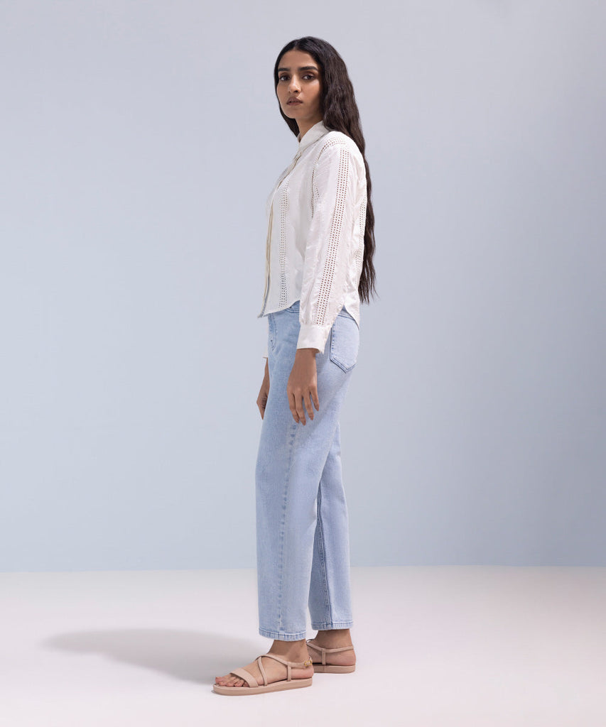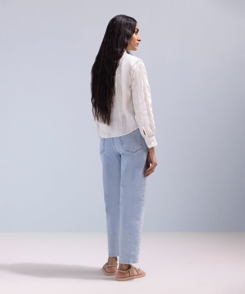 Embroidered shirt with collar and front button through closure. Full sleeves with cuffs. Curved hem detail.