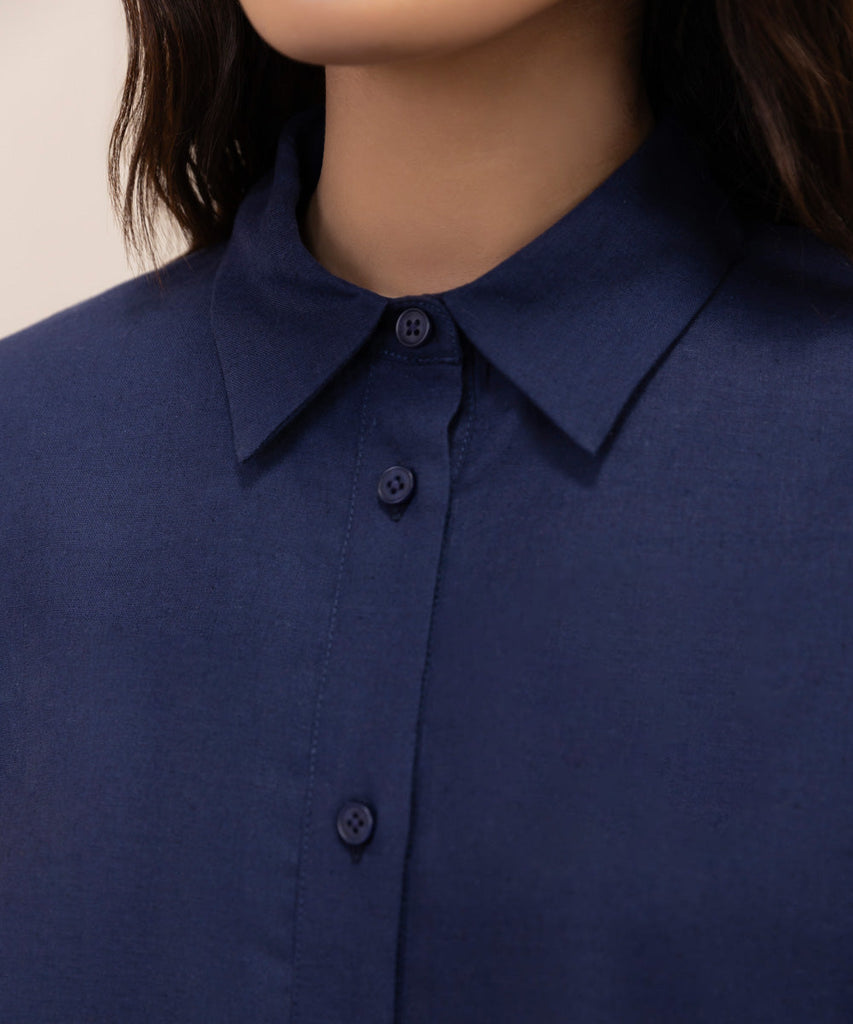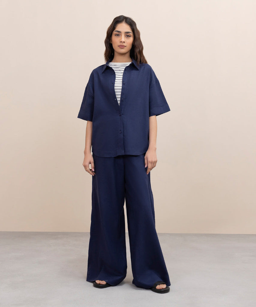 Boxy shirt in blended linen fabric. Collar and front button opening. Short sleeves.
