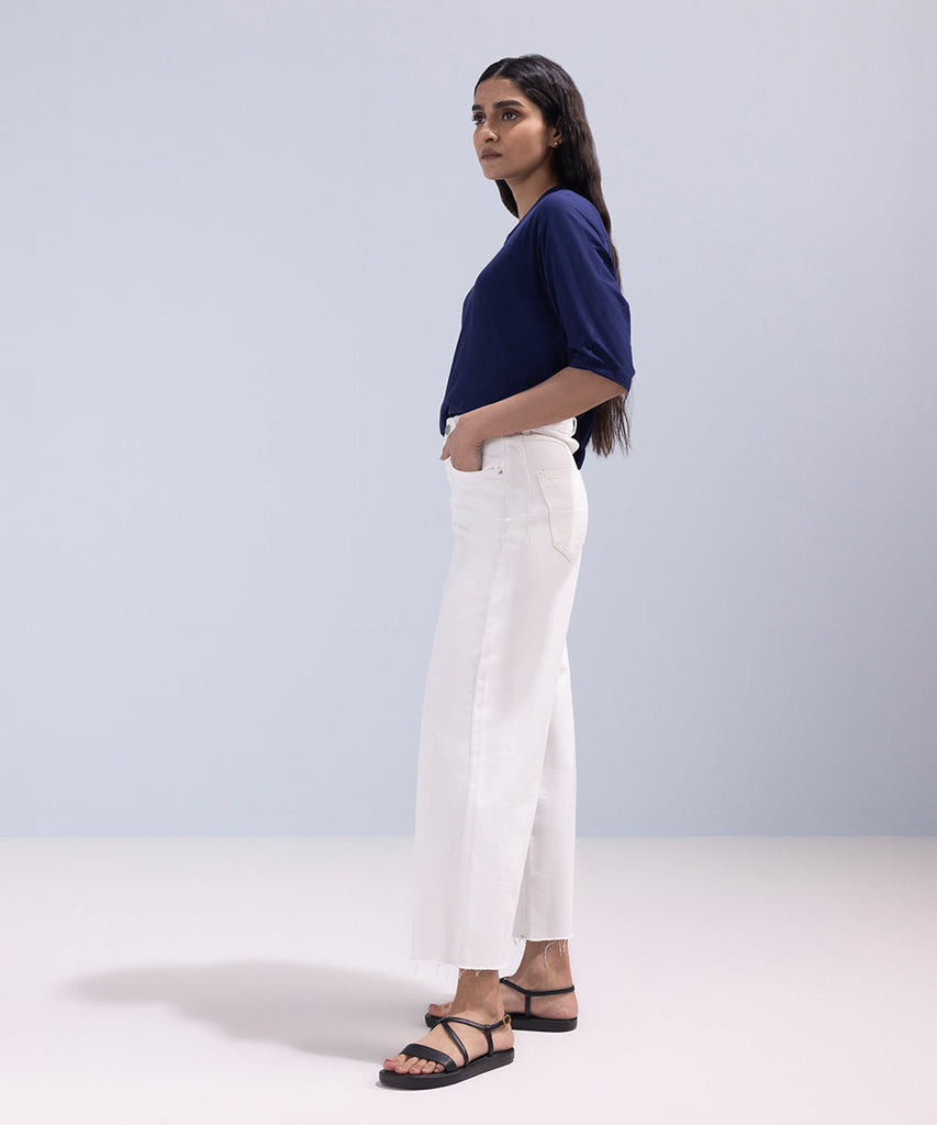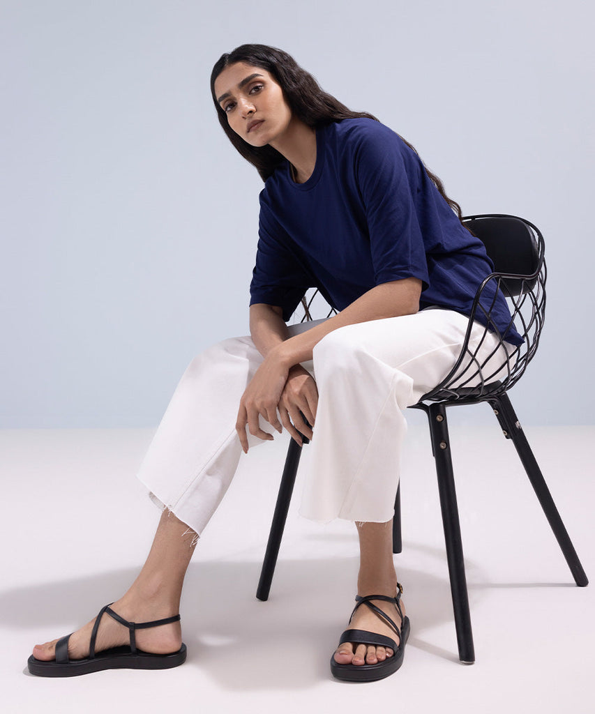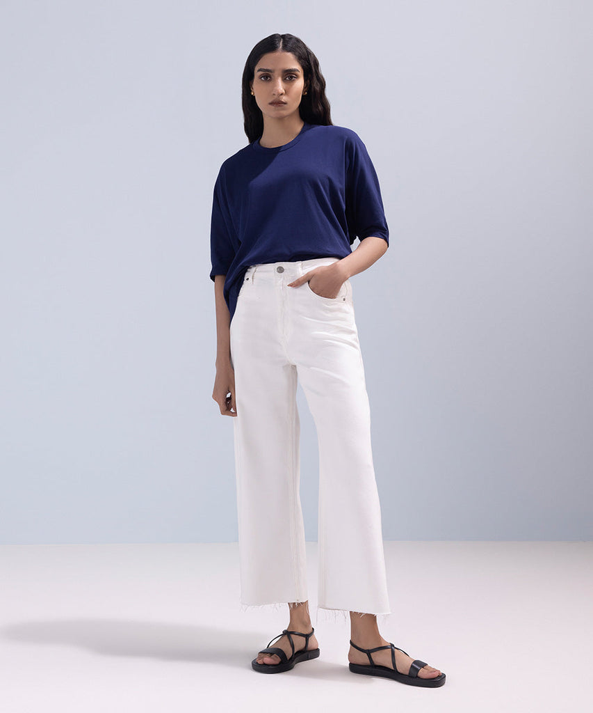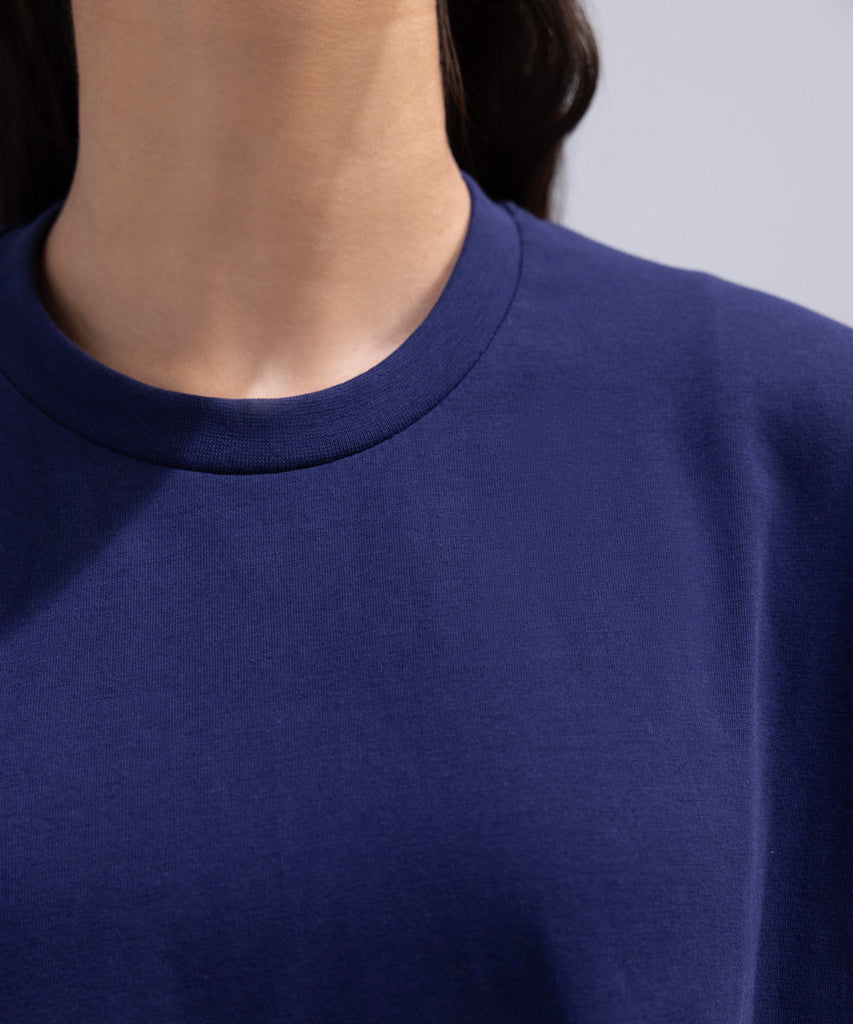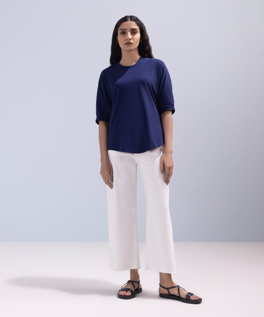Loose fit kimono shirt with side panel detail. Round neck and short sleeves. Centre back seam.