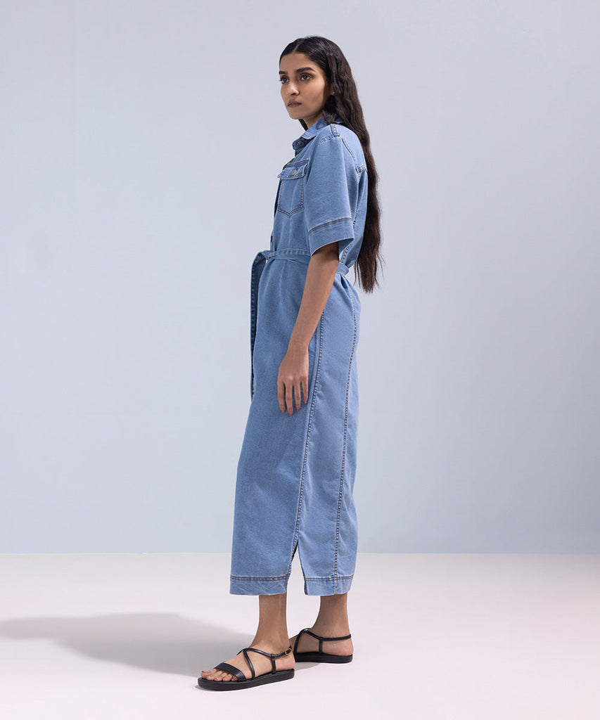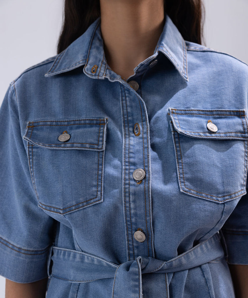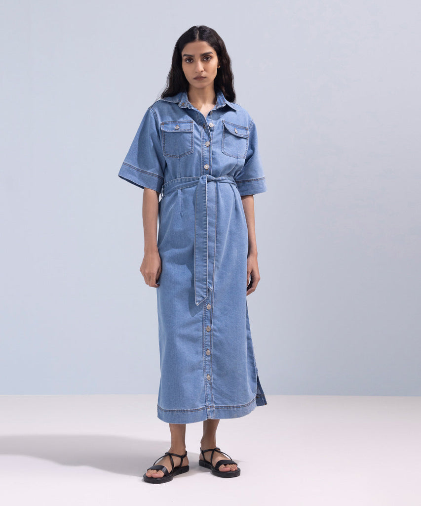 Mid wash heavy weight denim dress with collar and front button opening. Patch pocket. Belt and side hem slits.