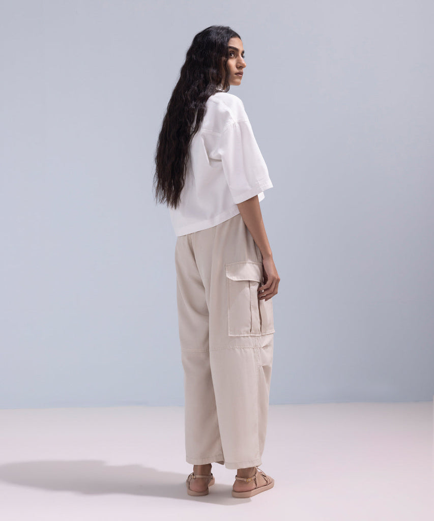 Light weight twill cropped shirt with collar and front button through opening. Short sleeves. Details: Colour: Off W...