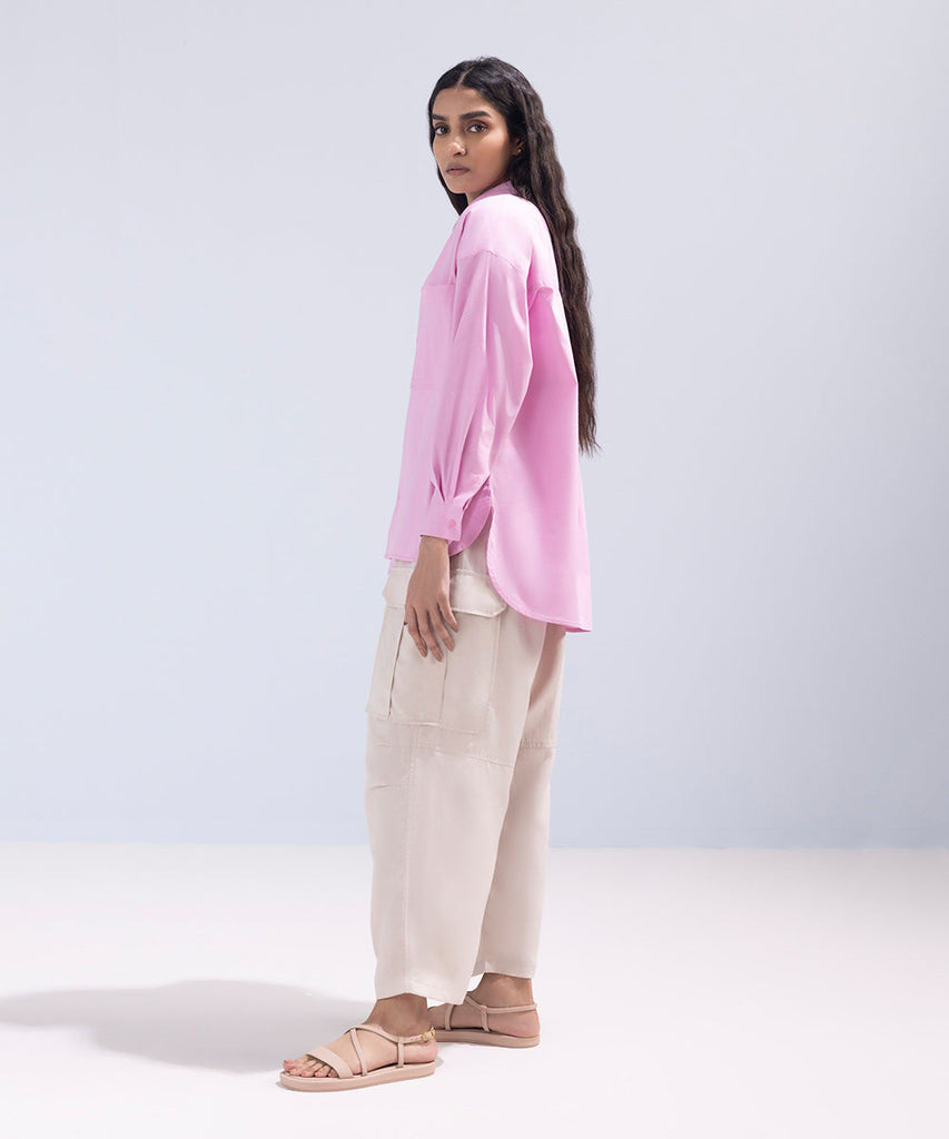 Oversized poplin shirt with collar and front button opening. Patch pockets, full sleeves. Back yoke and box pleat.