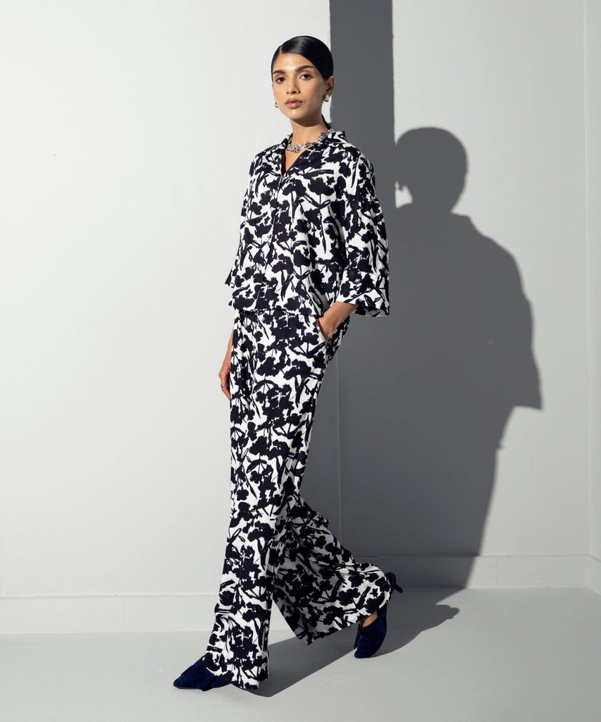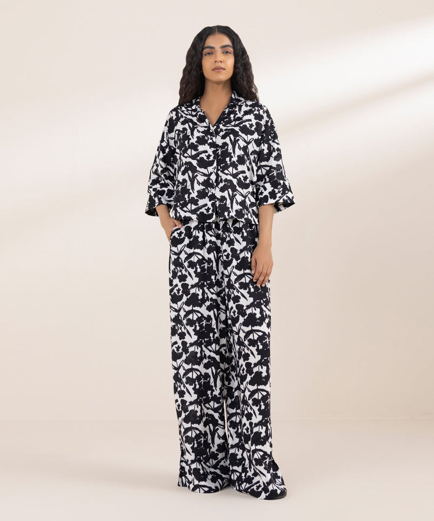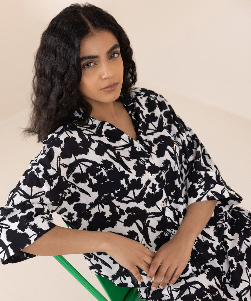 Printed shirt in flowy fabric. Collar with front opening. 3/4 sleeves. Round hem. Details: Colour: White & BlackF...