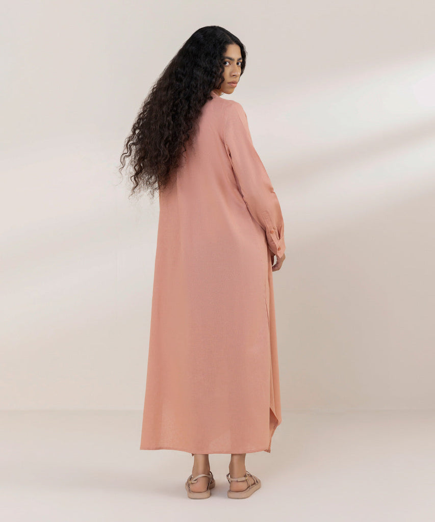 Linen dress with collar and front button through opening. Full sleeves with cuffs. Side slits. Details: Colour: Peach...