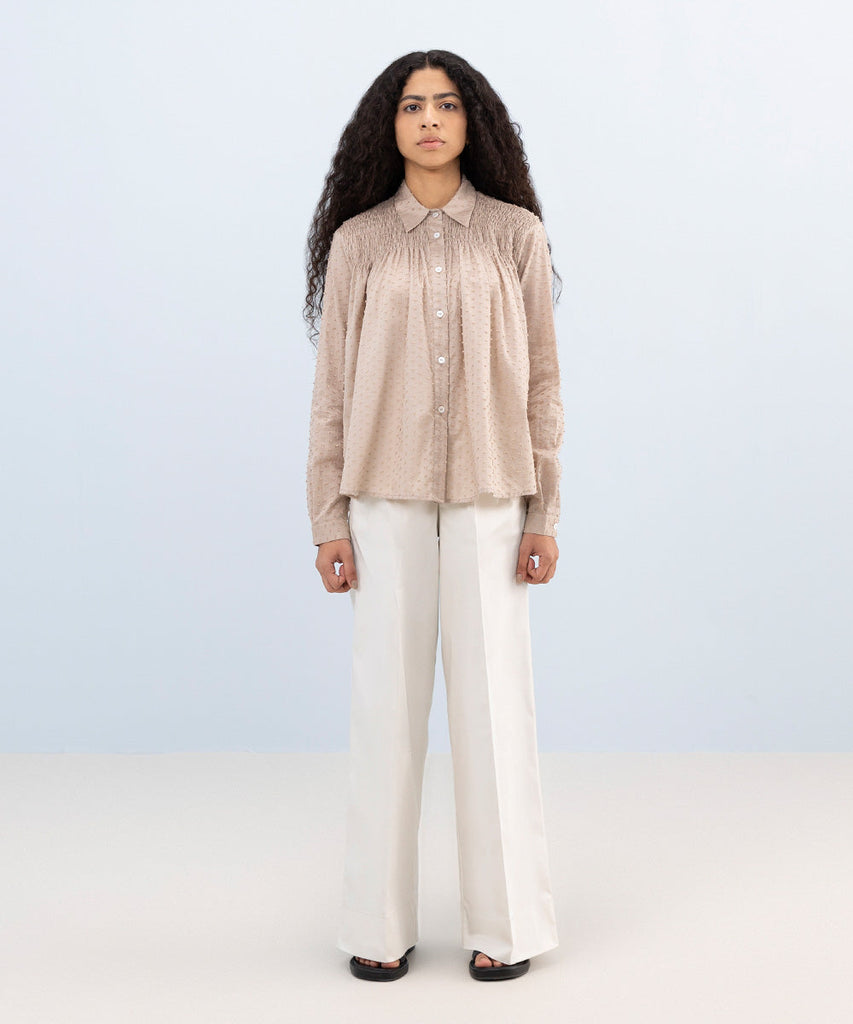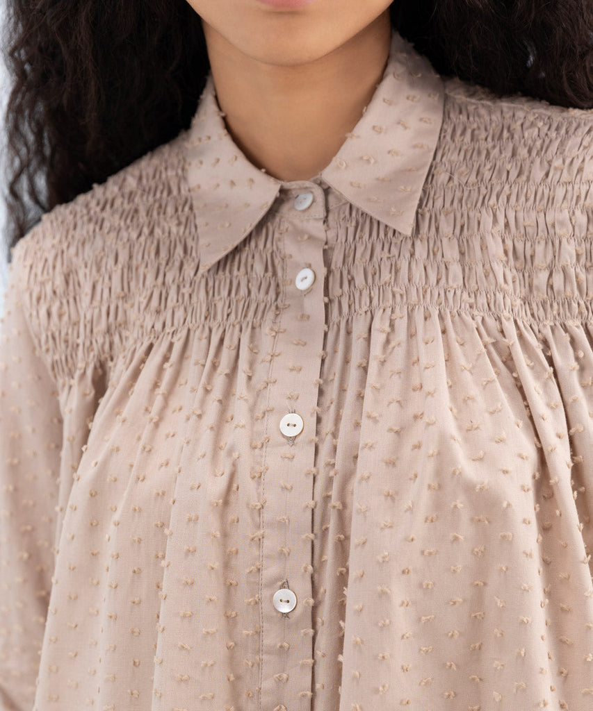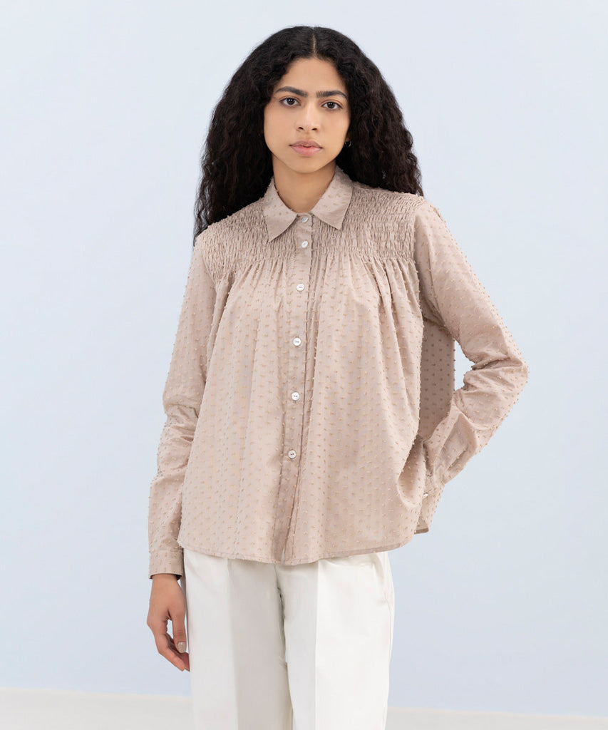 Top made in cotton jacquard fabric. Front button through shirt with collar. Full sleeves with cuffs. Front and back smocking detail.