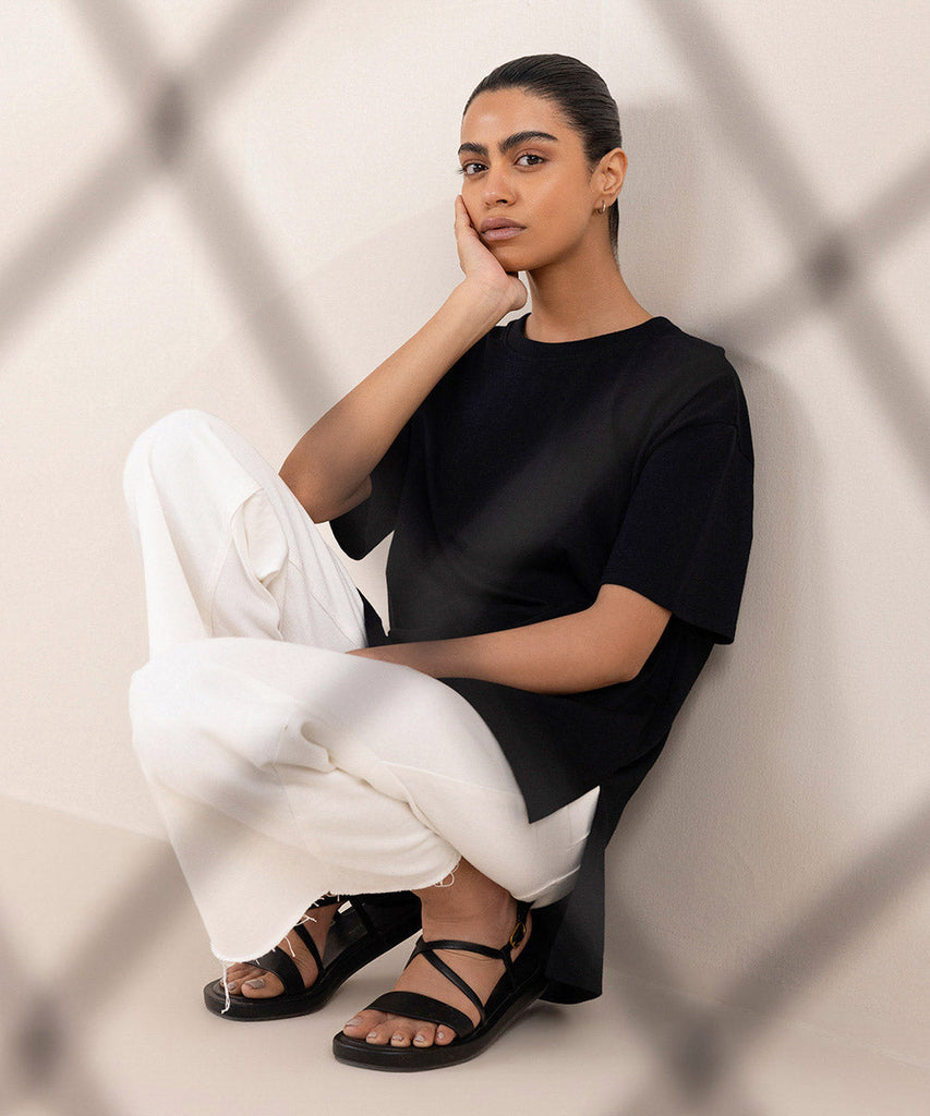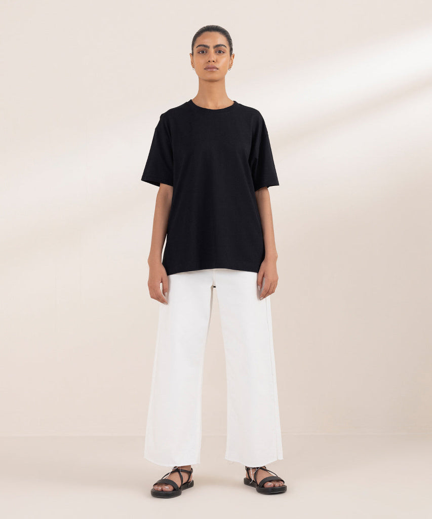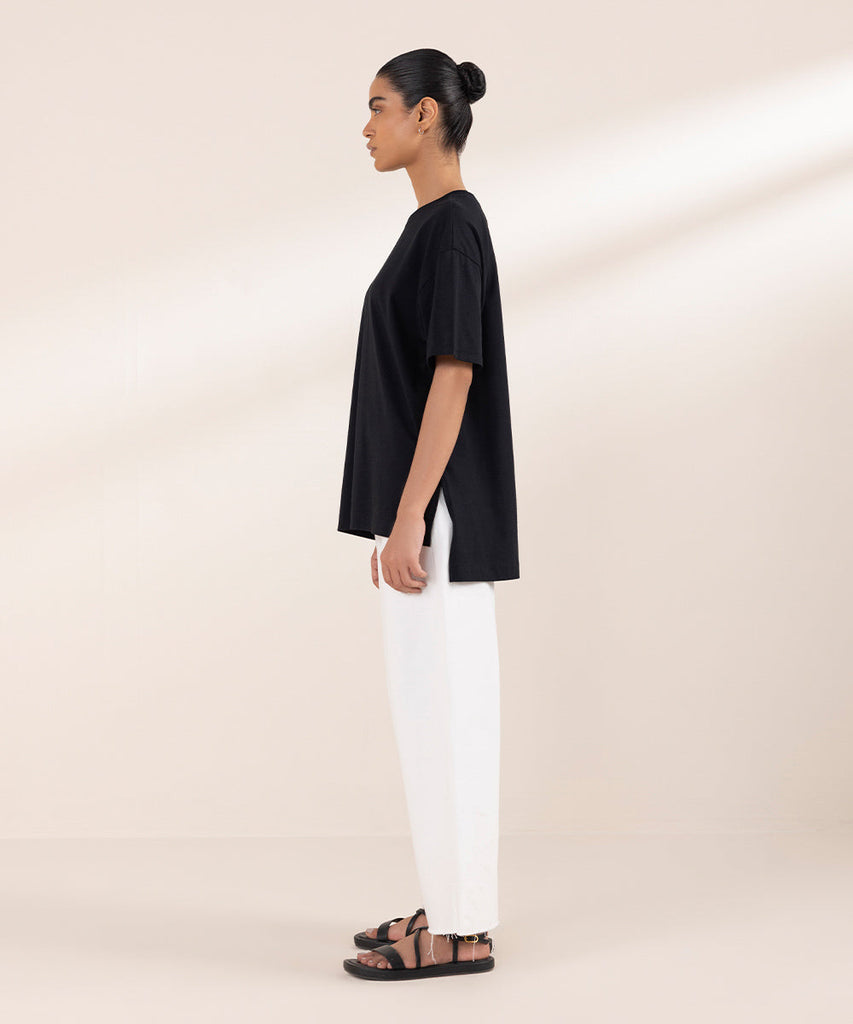 T-shirt with round neck, short sleeves and side slits. Dropped back hem.