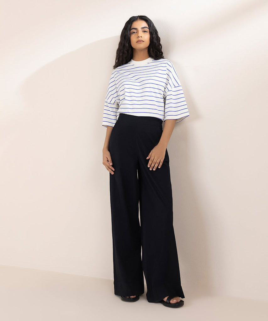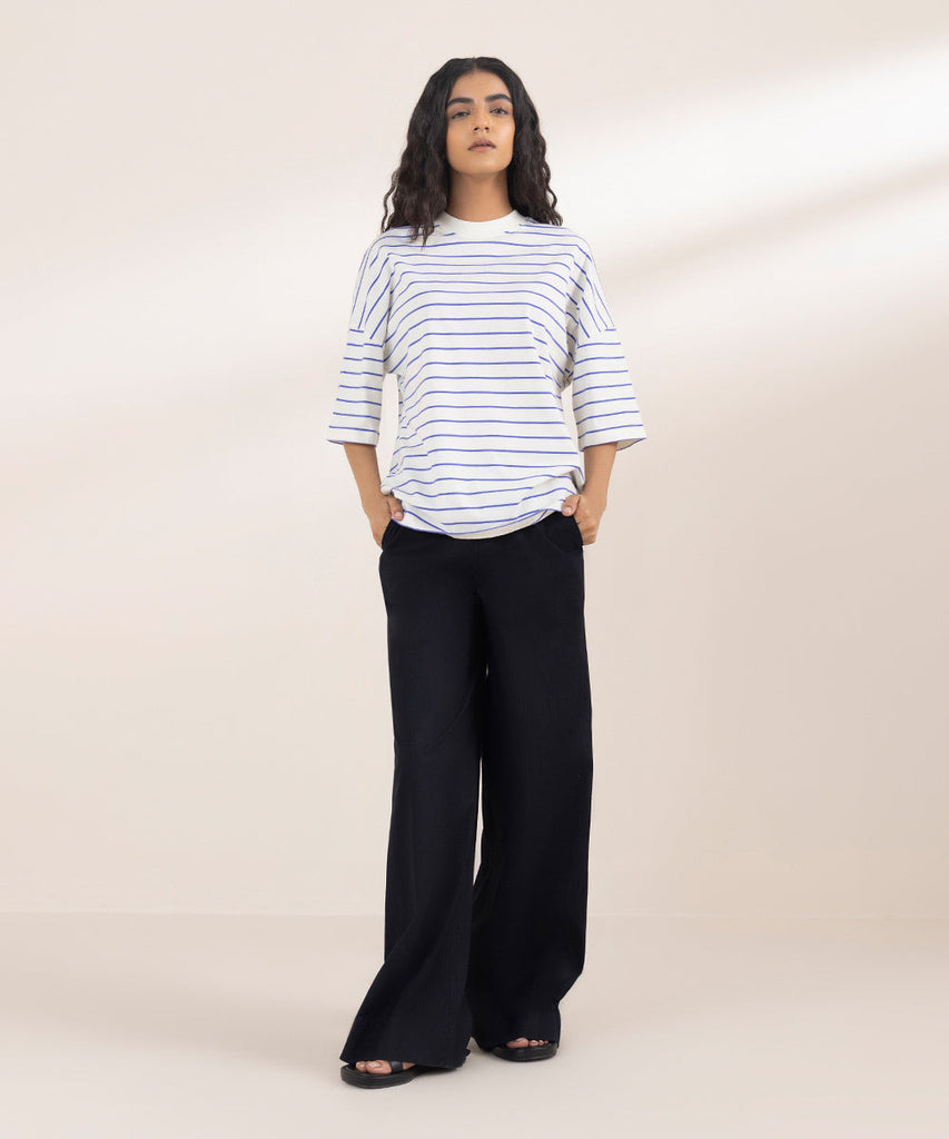 Oversized T-shirt with stripes. Short sleeves and round extended ribbed neck.