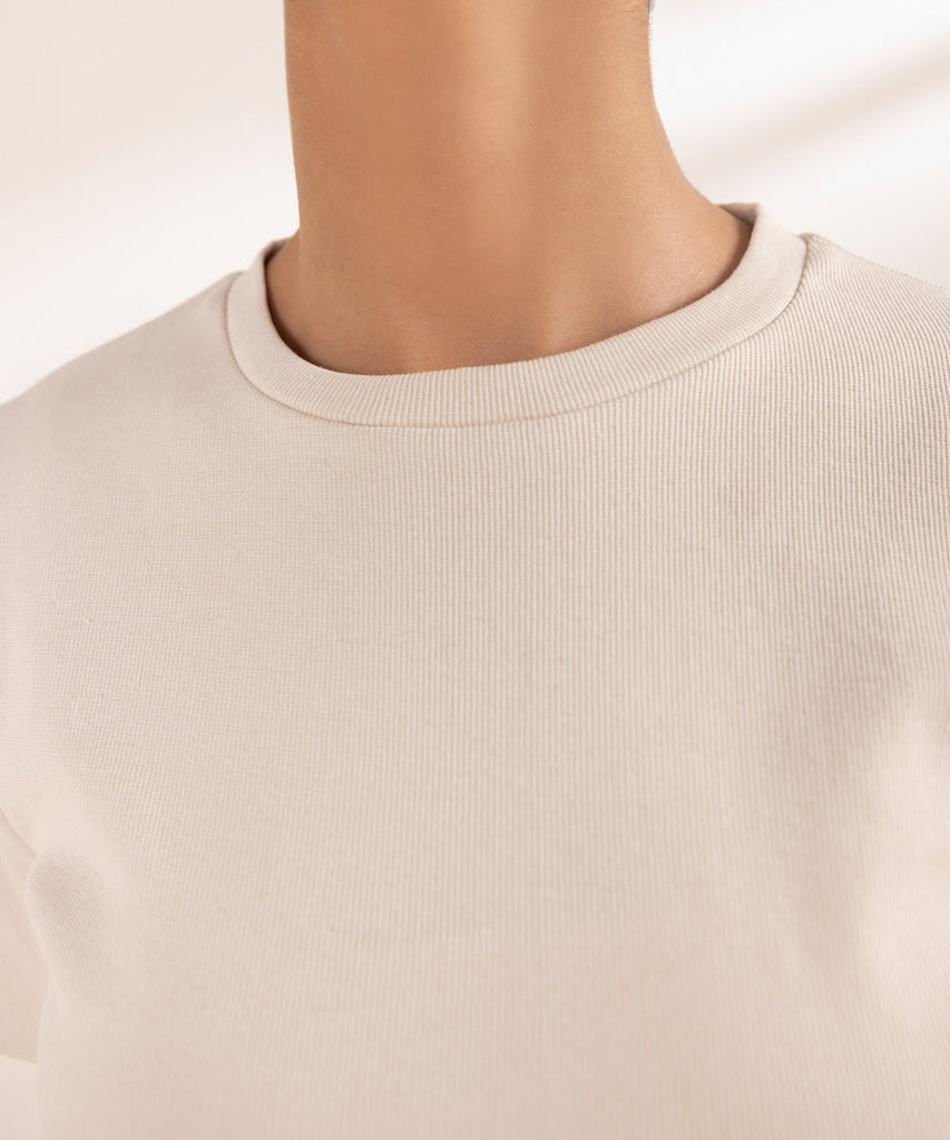 Slim fit T-shirt in ribbed fabric. Short sleeves and round neck. Details: Colour: BeigeFabric: 95% Cotton 5% Lycra Si...