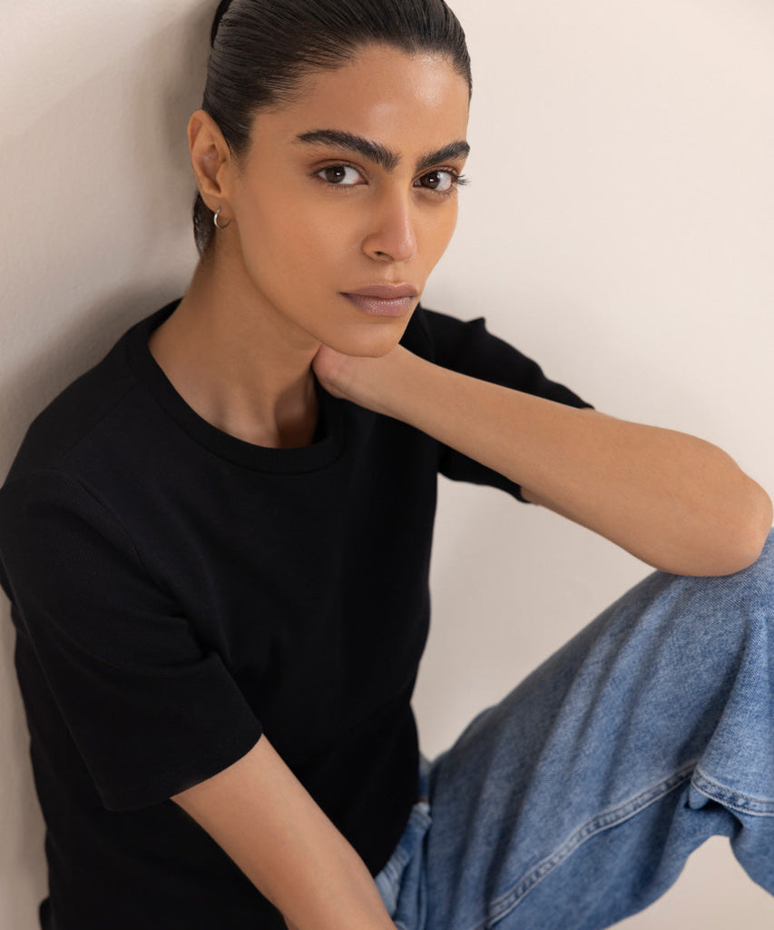 Slim fit T-shirt in ribbed fabric. Short sleeves and round neck. Details: Colour: BlackFabric: 95% Cotton 5% Lycra Si...