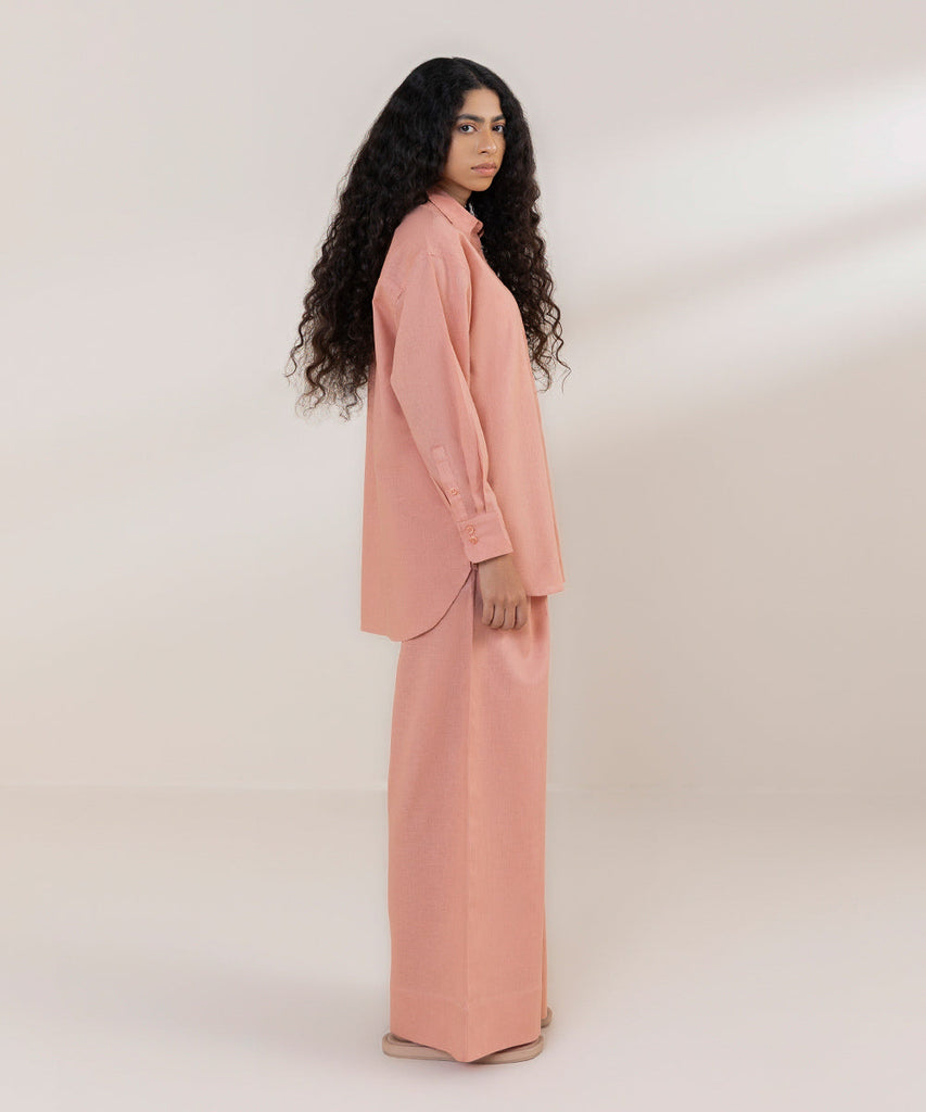 Oversized shirt with collar and front button through opening. Full sleeves with cuffs. Patch pocket. Back dropped hem...