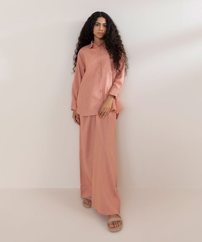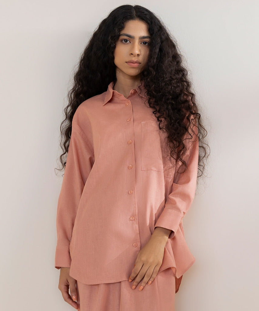 Oversized shirt with collar and front button through opening. Full sleeves with cuffs. Patch pocket. Back dropped hem.