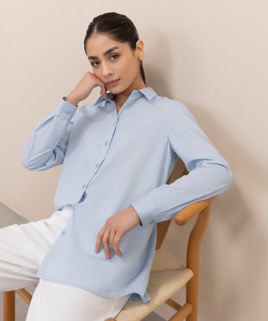 Button through shirt with collar and full sleeves. Details: Colour: Sky Blue Fabric: 100% Cotton Size & Fit Mode...